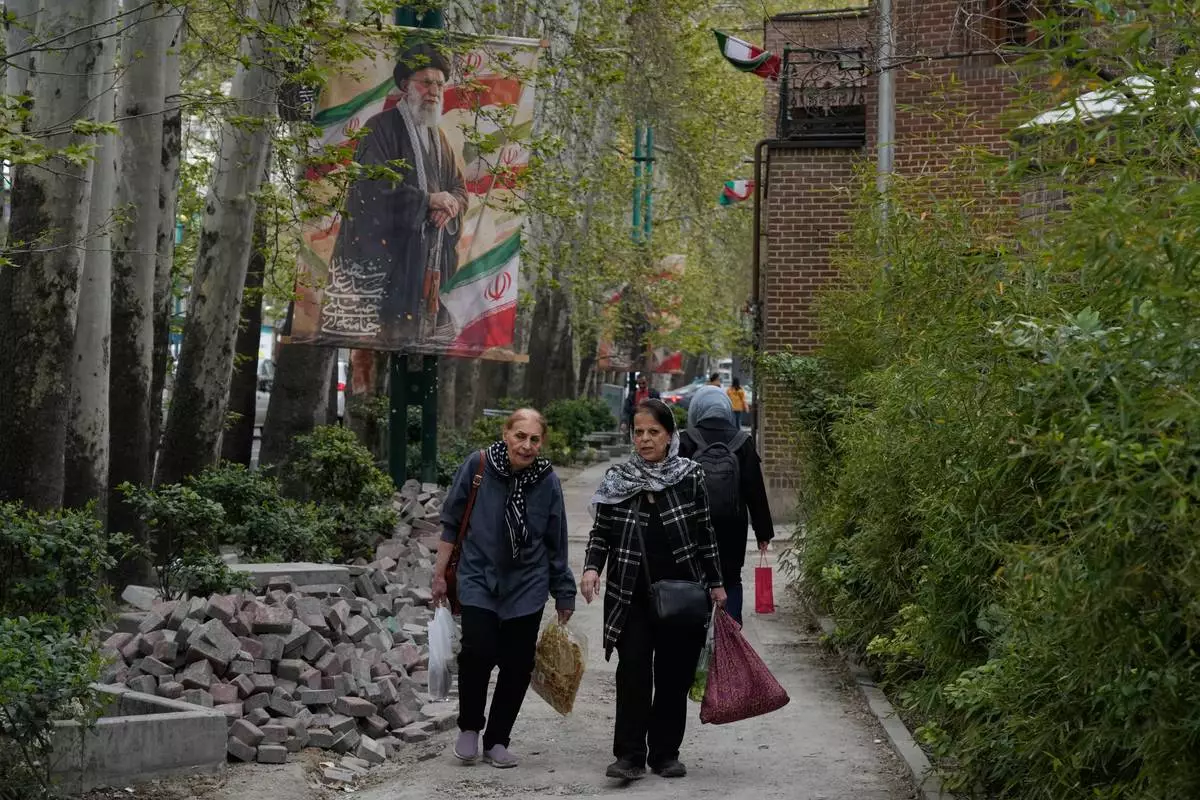 Women walk past a banner depicting the late Iranian Supreme Leader Ayatollah Ali Khamenei, who was killed in the U.S. and Israel strikes on Feb. 28, in northern Tehran, Iran, Sunday, April 12, 2026. (AP Photo/Vahid Salemi)