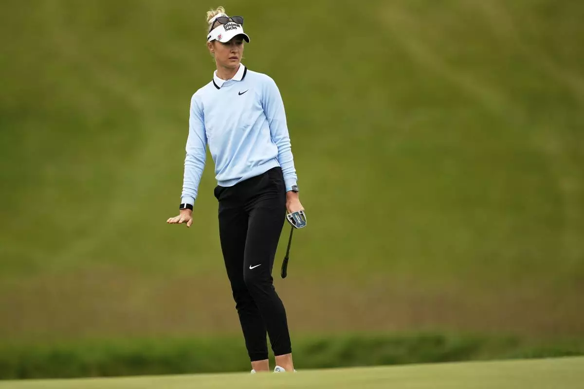 Nelly Korda reacts to her putt on the 18th hole during the second round of the U.S. Women's Open golf tournament at Erin Hills Friday, May 30, 2025, in Erin, Wis. (AP Photo/Matt York)