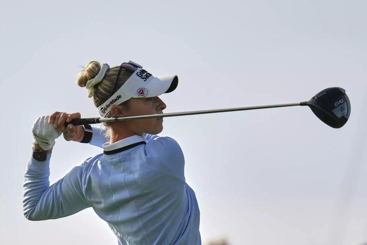 Nelly Korda hits from the 12th tee during the second round of the U.S. Women's Open golf tournament at Erin Hills Friday, May 30, 2025, in Erin, Wis. (AP Photo/Jeff Roberson)
