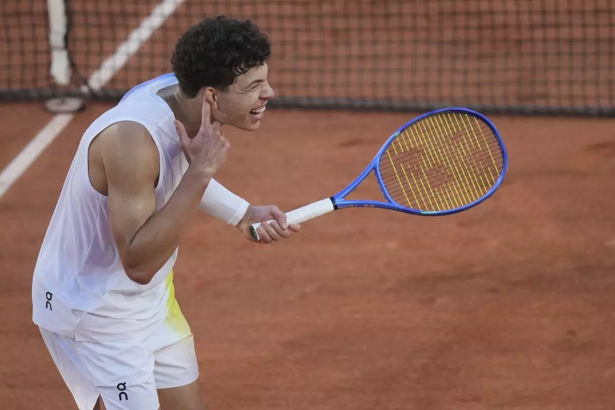 Ben Shelton of the U.S. celebrates winning against Italy's Matteo Gigante during their third round match of the French Tennis Open, at the Roland-Garros stadium, in Paris, Friday, May 30, 2025. (AP Photo/Thibault Camus)