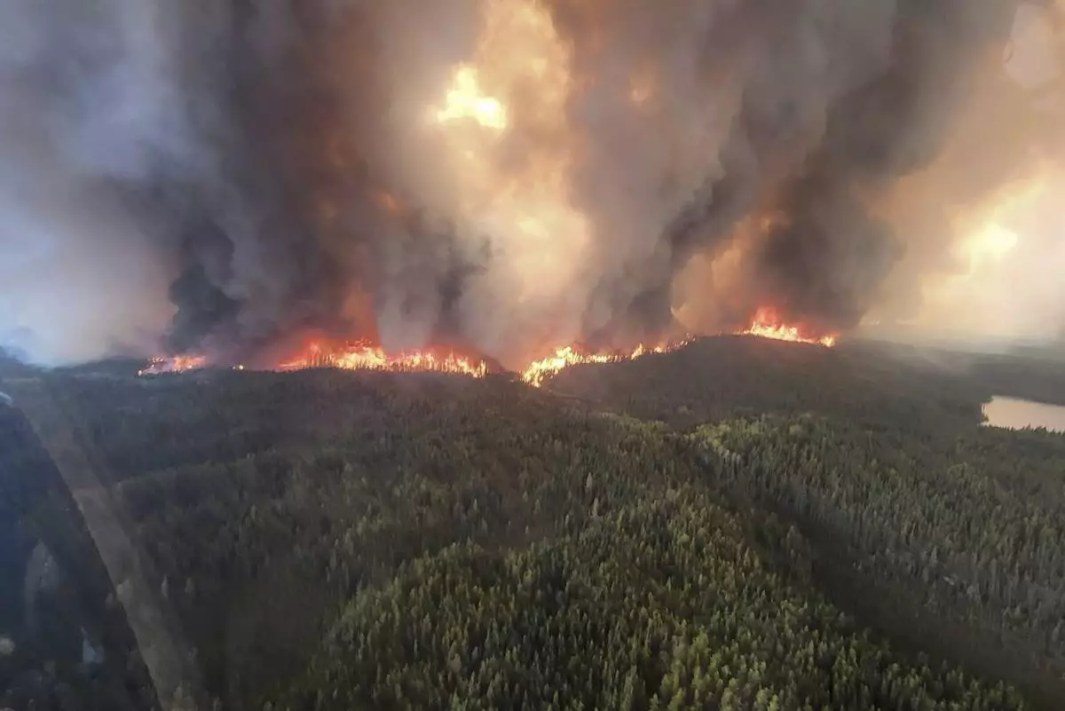 This photo provided by the Manitoba government shows wildfires in Sherridon, Manitoba, Canada, on Tuesday, May 27, 2025. (Manitoba government via AP)