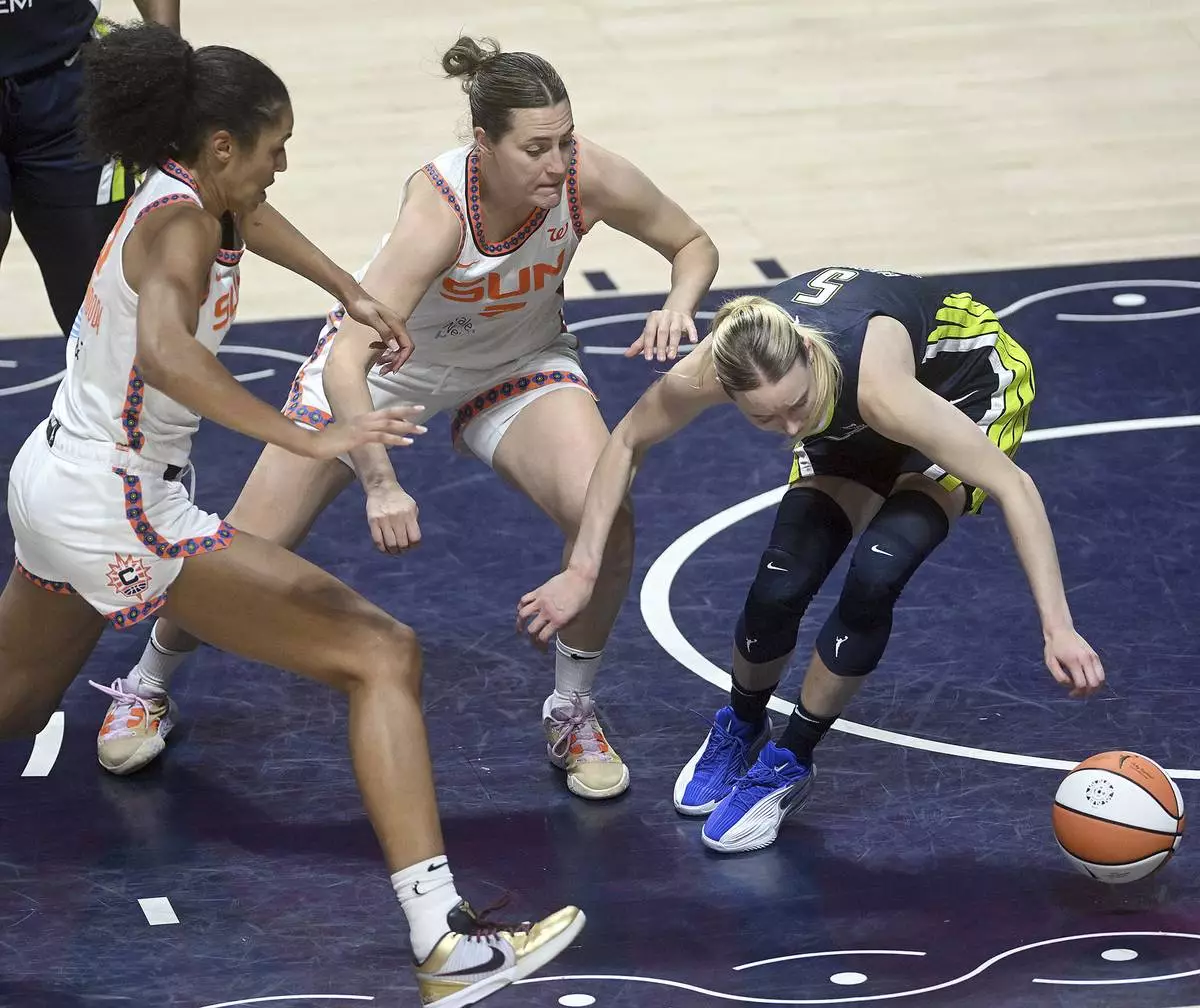 Dallas Wing's Paige Bueckers, right, and Connecticut Sun's Haley Peters, center, and Olivia Nelson-Ododa push for a rebound during a WNBA basketball game Tuesday, May 27, 2025, in Uncasville, Conn. (Sarah Gordon/The Day via AP)