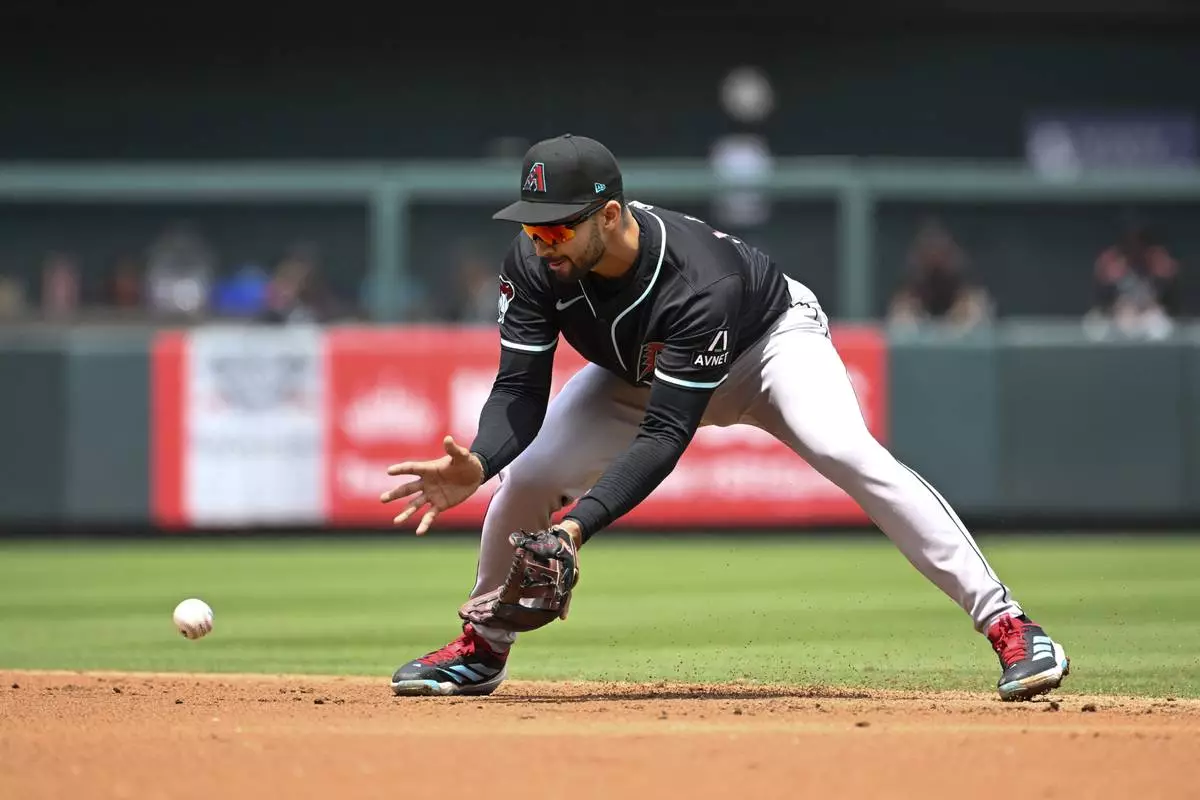 Arizona Diamondbacks second baseman Jordan Lawlar fields a ground ball hit by St. Louis Cardinals' Victor Scott II in the second inning of a baseball game, Saturday May 24, 2025, in St. Louis. (AP Photo/Joe Puetz)