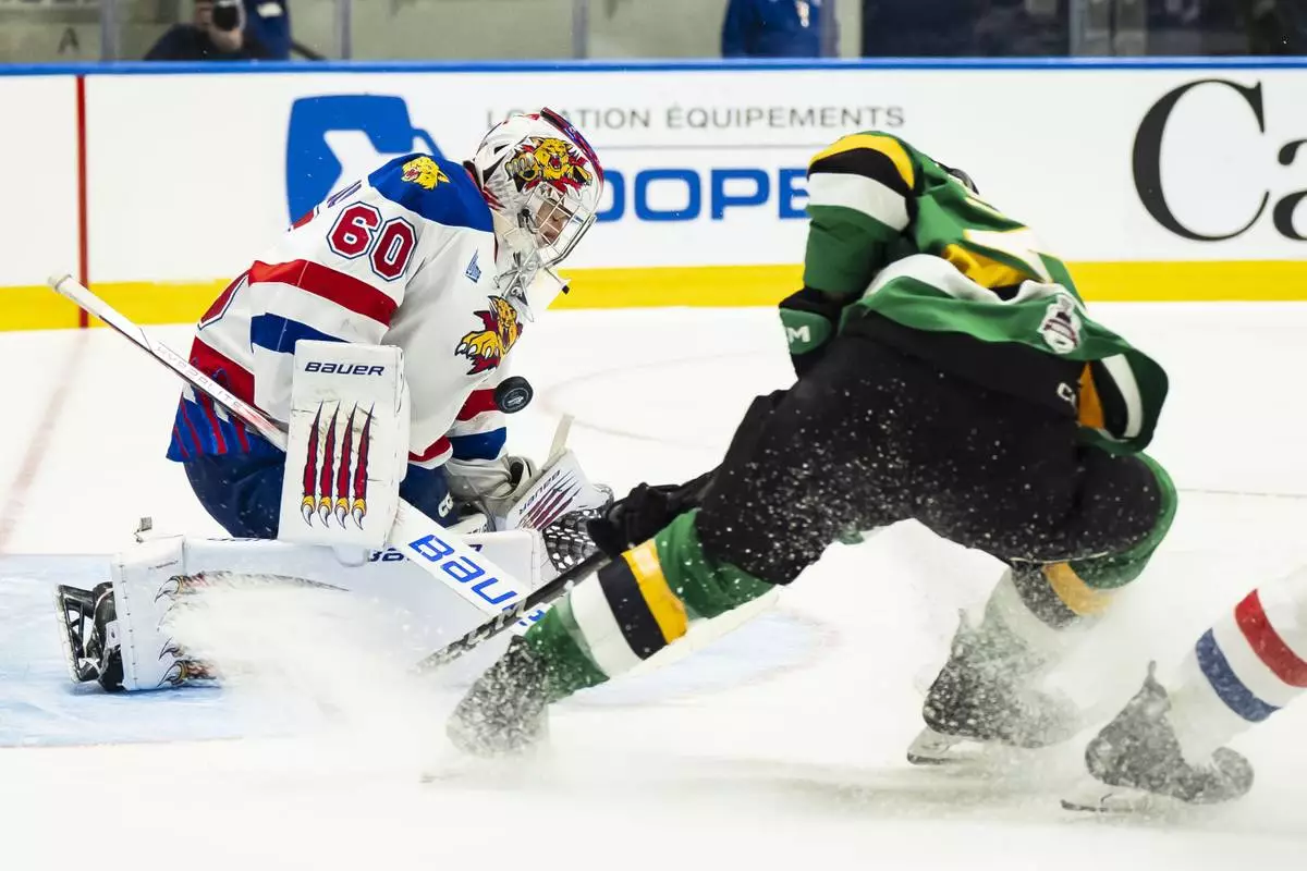 Moncton Wildcats goaltender Mathis Rousseau (60) makes a save against London Knights' Sam O'Reilly (23) during first-period semifinal Memorial Cup hockey action in Rimouski, Quebec, Friday, May 30, 2025. (Christopher Katsarov/The Canadian Press via AP)