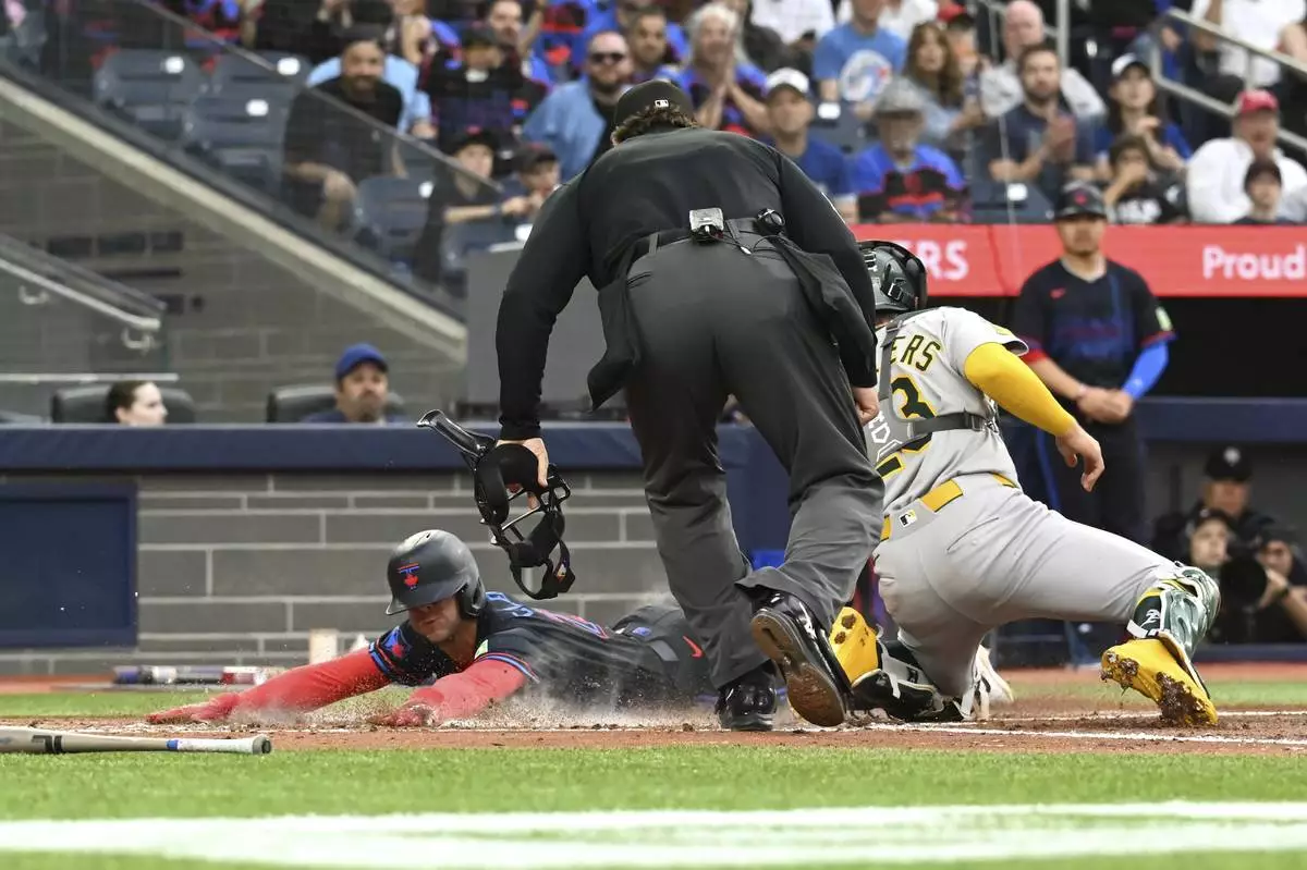 Toronto Blue Jays' Ernie Clement (22) slides safely into home ahead of a tag by Athletics catcher Shea Langeliers (23) in second inning MLB baseball action in Toronto on Friday, May 30, 2025. (Jon Blacker/The Canadian Press via AP)