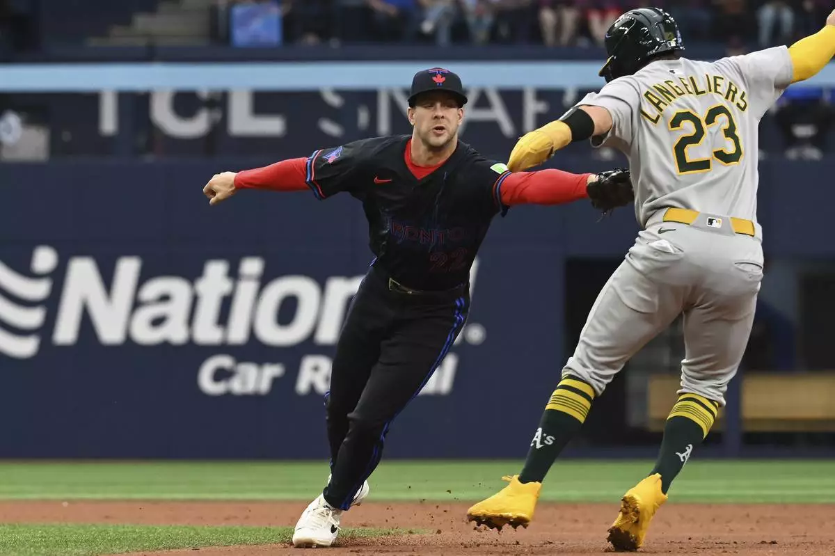 Toronto Blue Jays second baseman Ernie Clement (22) tags out Athletics' Shea Langeliers (23) in second inning MLB baseball action in Toronto on Friday, May 30, 2025. (Jon Blacker/The Canadian Press via AP)