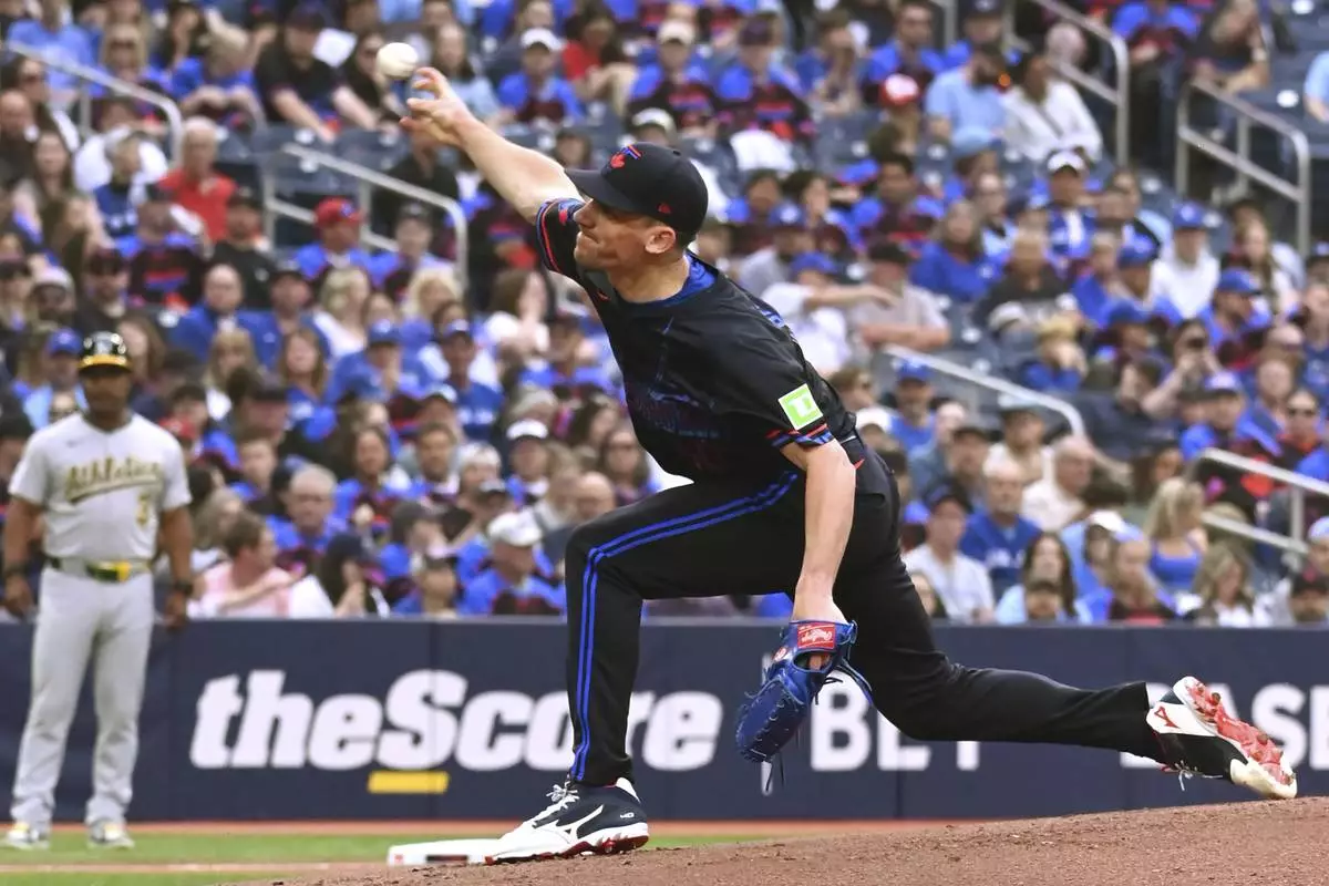 Toronto Blue Jays starting pitcher Chris Bassitt (40) throws to an Athletics batter in first inning MLB baseball action in Toronto on Friday, May 30, 2025. (Jon Blacker/The Canadian Press via AP)