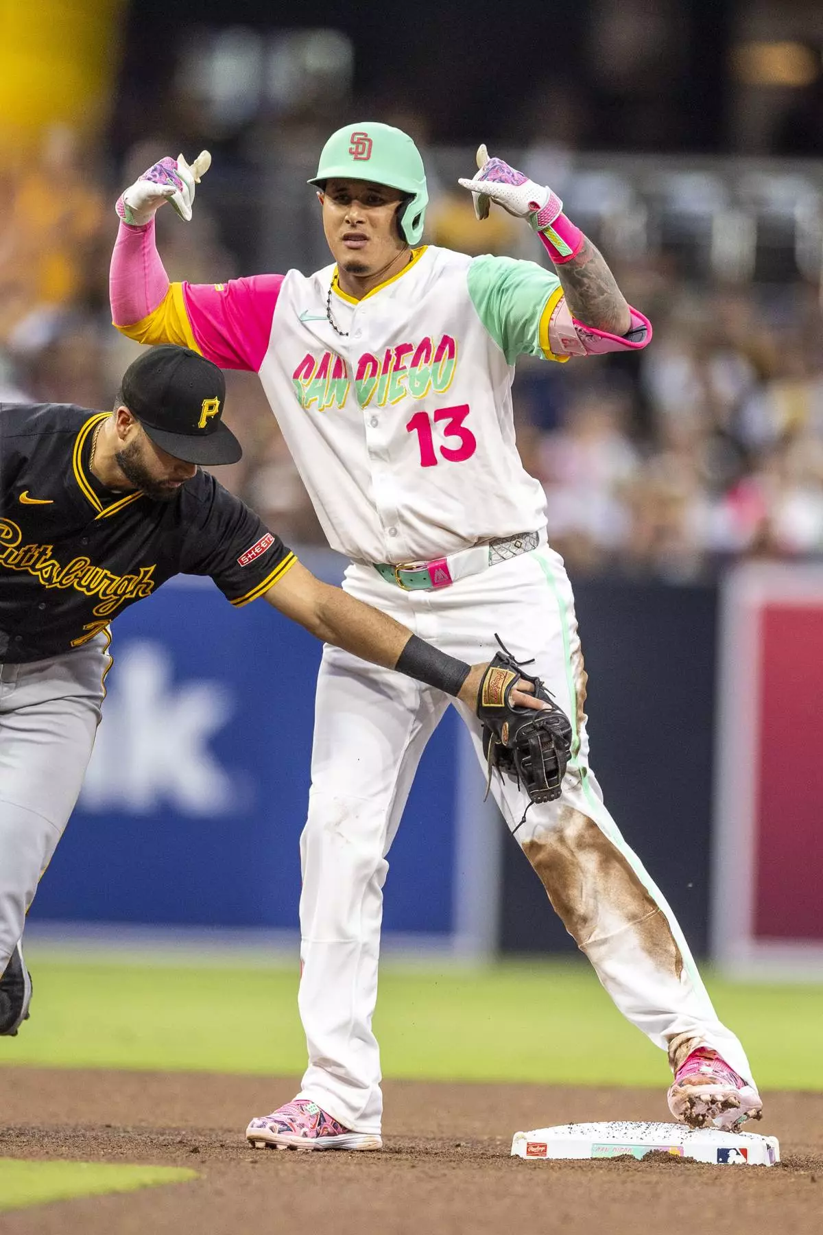 San Diego Padres third baseman Manny Machado (13) signals that he should be safe at second base after sliding past Pittsburgh Pirates shortstop Isiah Kiner-Falefa, left, in the fourth inning of a baseball game, Friday, May 30, 2025, in San Diego. (AP Photo/Tony Ding)