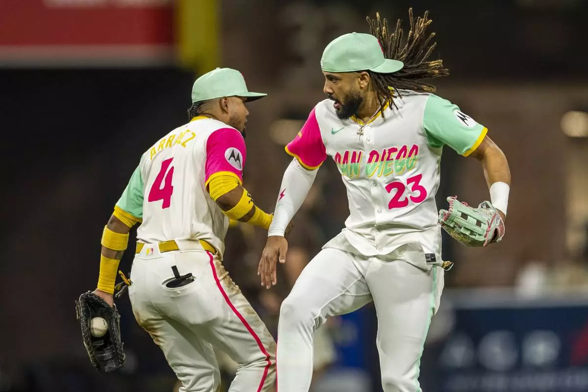 San Diego Padres first baseman Luis Arraez (4) and right fielder Fernando Tatis Jr. (23) celebrate after winning a baseball game against the Pittsburgh Pirates, Friday, May 30, 2025, in San Diego. (AP Photo/Tony Ding)