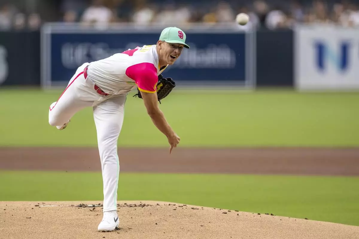 San Diego Padres starting pitcher Nick Pivetta throws against a Pittsburgh Pirates batter in the first inning of a baseball game, Friday, May 30, 2025, in San Diego. (AP Photo/Tony Ding)