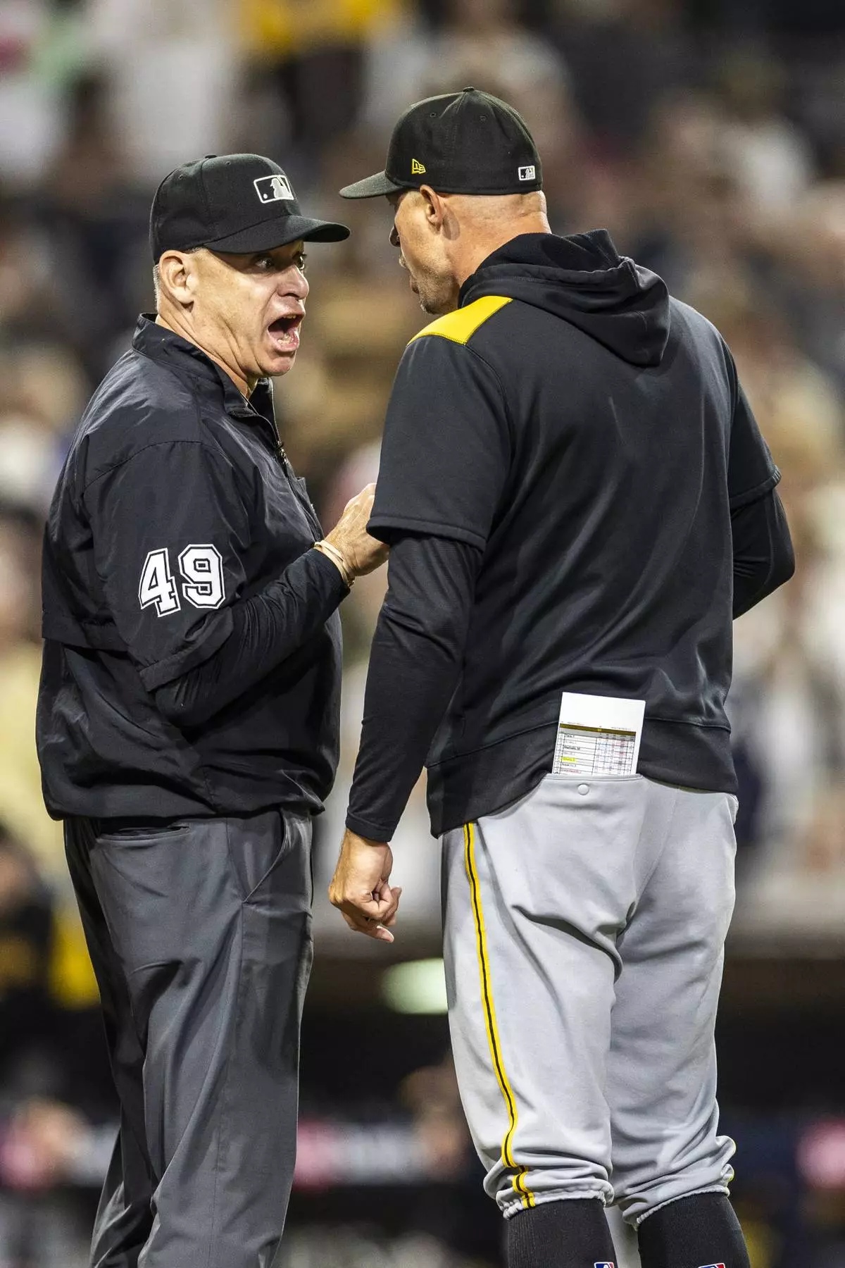 Umpire Andy Fletcher (49) talks with Pittsburgh Pirates manager Don Kelly, right, after the eighth inning of a baseball game against the San Diego Padres, Friday, May 30, 2025, in San Diego. (AP Photo/Tony Ding)