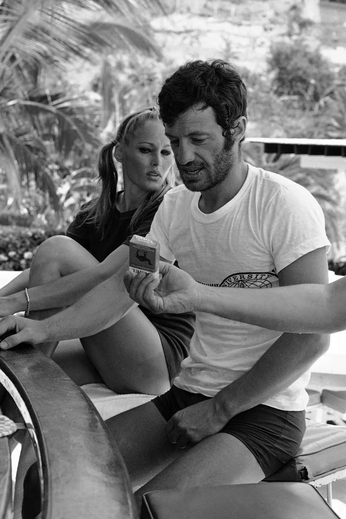 FILE - Accompanied by Swedish Movie star Ursula Andress, French actor Jean Belmondo looks down at a pack of cigarettes being offered to him at their hotel's pool-side bar, April 18, 1967, in Acapulco, Mexico. (AP Photo, File)