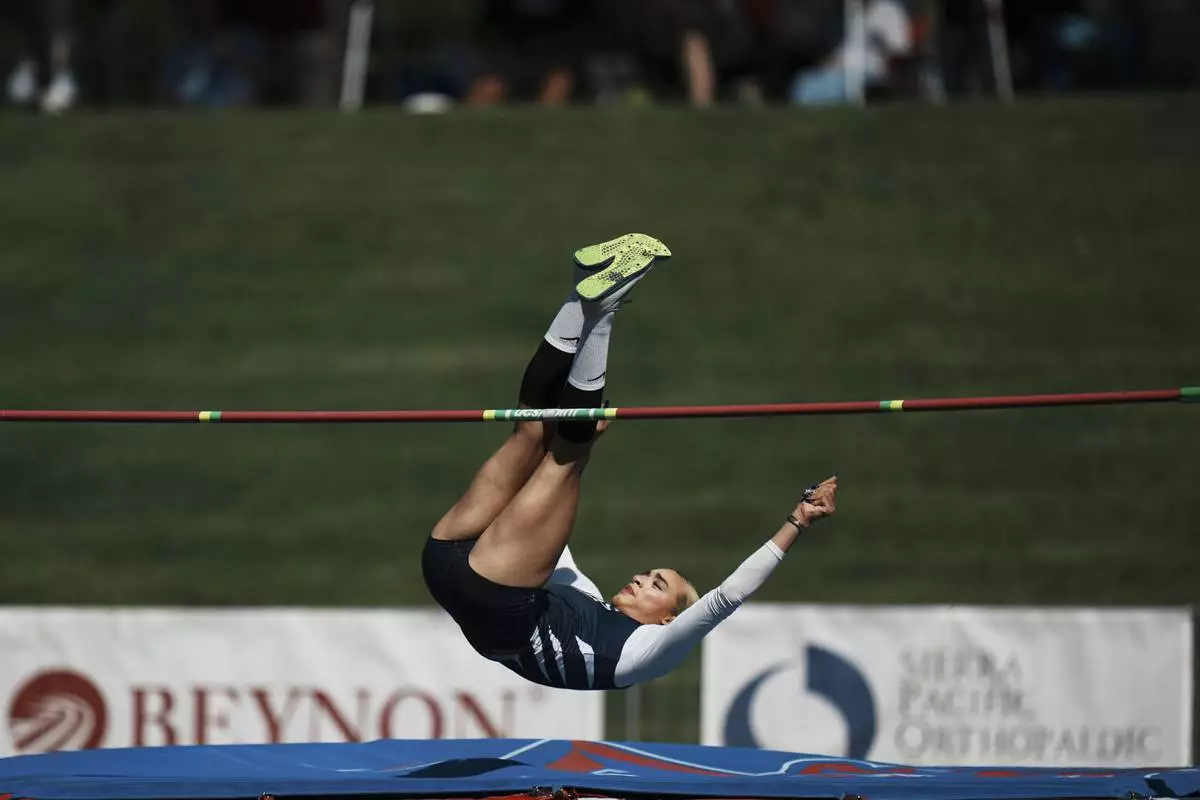 AB Hernandez, a transgender student at Jurupa Valley High School, competes in the high jump at the California high school track-and-field championships in Clovis, Calif., Saturday, May 31, 2025. (AP Photo/Jae C. Hong)