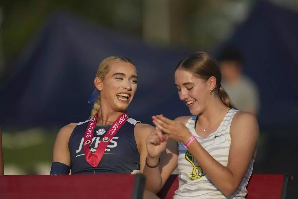 First-place winners AB Hernandez, left, and Jillene Wetteland share a light moment before the medal ceremony for the high jump at the California high school track-and-field championships in Clovis, Calif., Saturday, May 31, 2025. (AP Photo/Jae C. Hong)