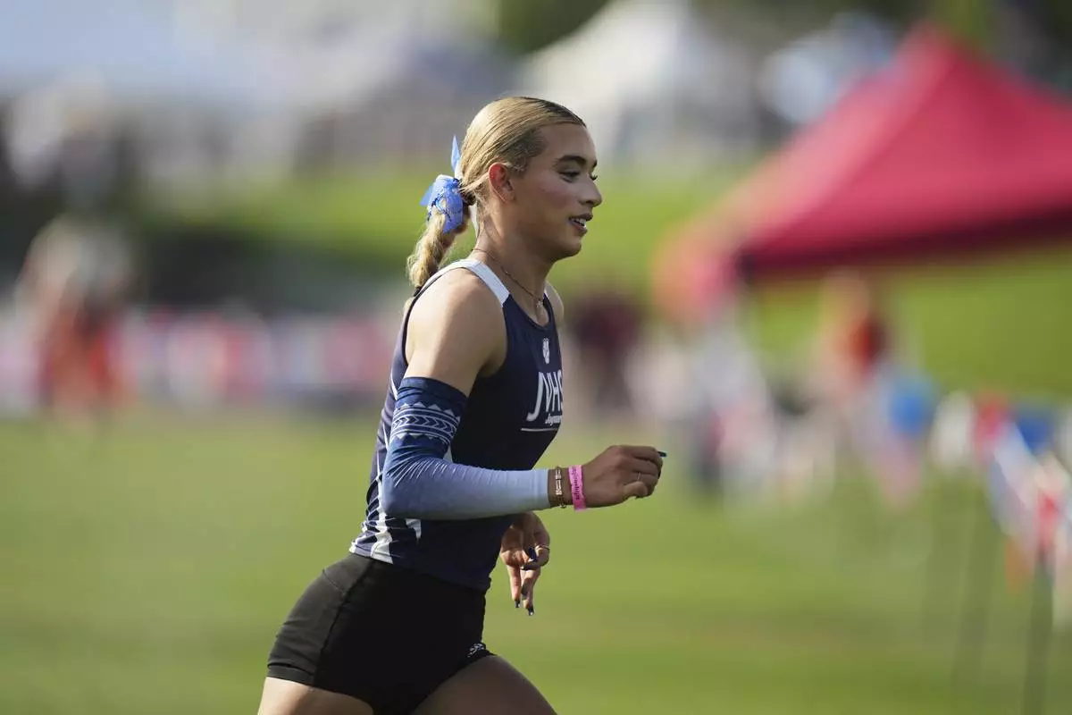 AB Hernandez, a transgender student at Jurupa Valley High School, runs across the field at the California high school track-and-field championships in Clovis, Calif., Saturday, May 31, 2025. (AP Photo/Jae C. Hong)