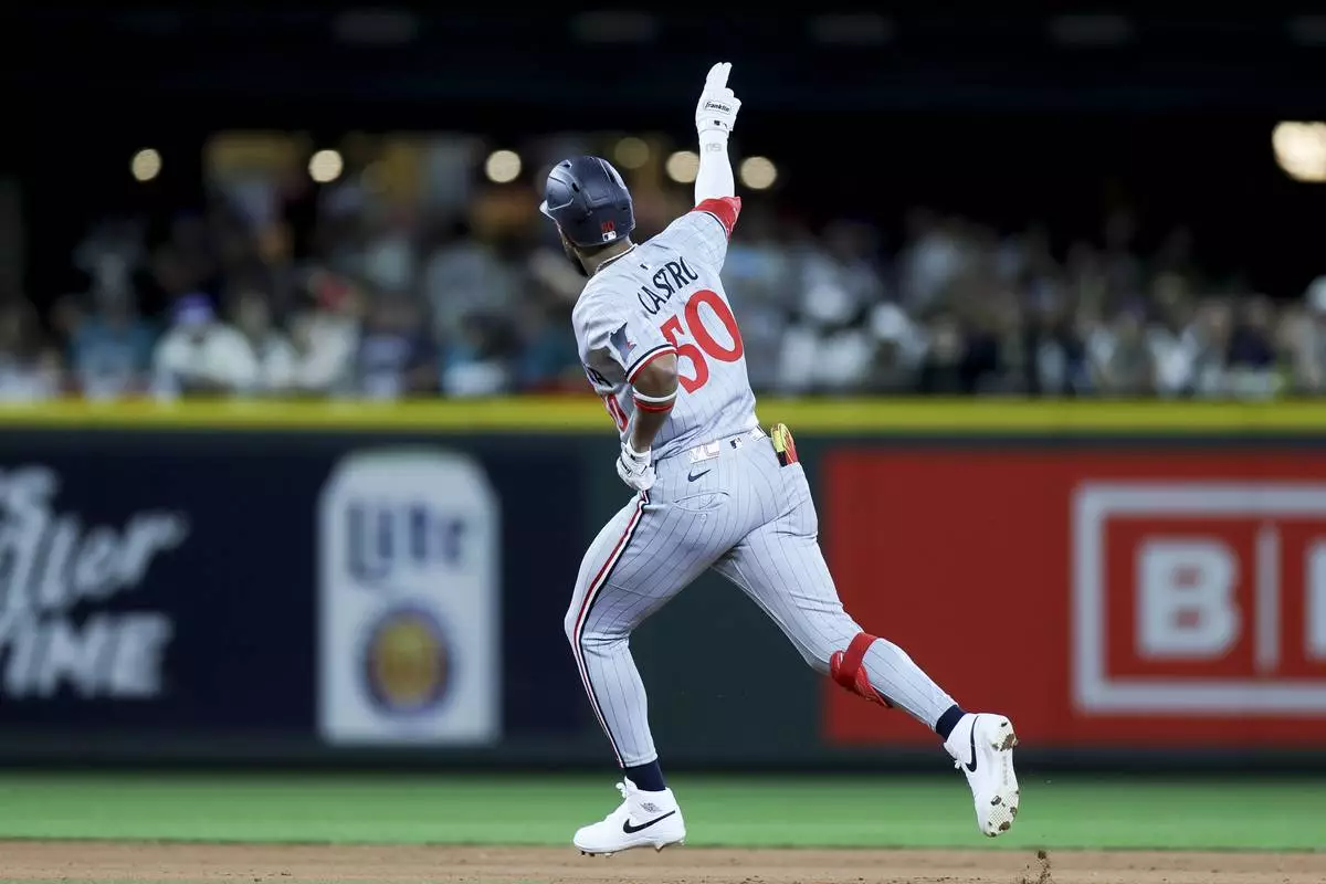 Minnesota Twins' Willi Castro celebrates while running the bases after hitting a two-run home run that scored Ty France during the ninth inning of a baseball game against the Seattle Mariners Friday, May 30, 2025, in Seattle. (AP Photo/Ryan Sun)