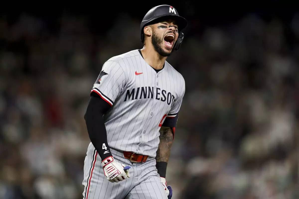Minnesota Twins' Carlos Correa celebrates after hitting a go-ahead two-run home run during the 10th inning of a baseball game against the Seattle Mariners Friday, May 30, 2025, in Seattle. DaShawn Keirsey Jr. also scored. (AP Photo/Ryan Sun)