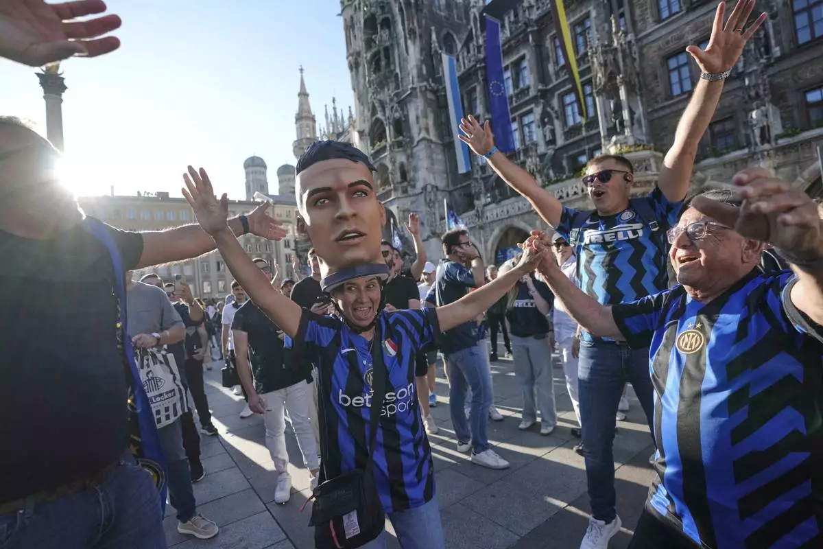 An Inter fan, wearing an effigy of Lautaro Martinez on her head reacts ahead of the Champions League final soccer match between Paris Saint-Germain and Inter Milan in Munich, Germany, Friday, May 30, 2025. (AP Photo/Markus Schreiber)