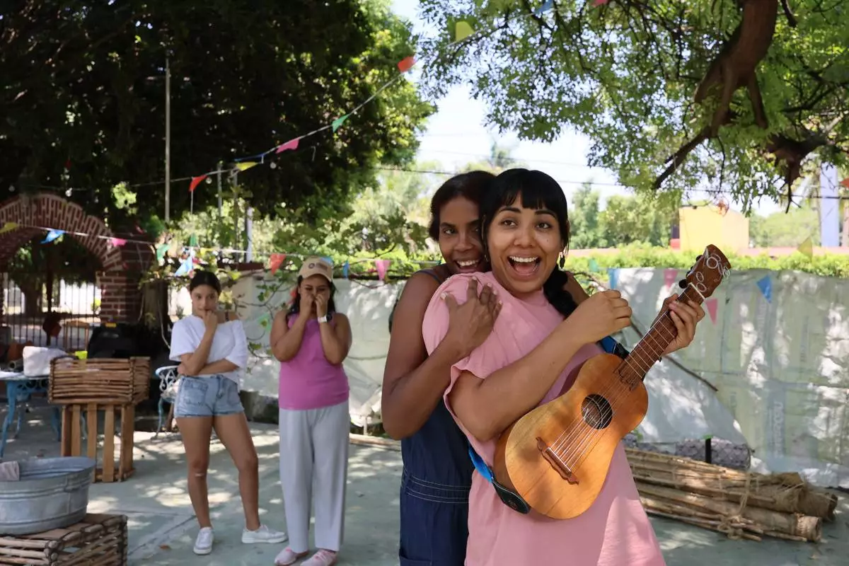 Mulato Teatro cast members Eréndira Castorela, strumming a jarana jarocha, and Marisol Castillo, rehearse for their upcoming performance in the First International Afro-Scenic Festival, in Ticumán, Mexico, Saturday, May 17, 2025. (AP Photo/Ginnette Riquelme)