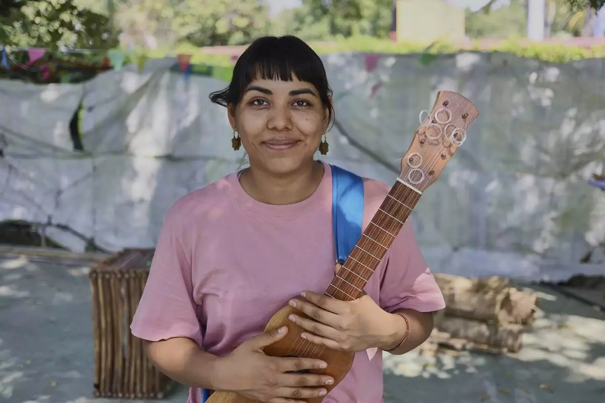 Afro Mexican activist and actress Eréndira Castorela poses for a photo with her jarana jarocha instrument during a break from a Mulato Teatro rehearsal, in Ticumán, Mexico, Saturday, May 17, 2025. (AP Photo/Ginnette Riquelme)