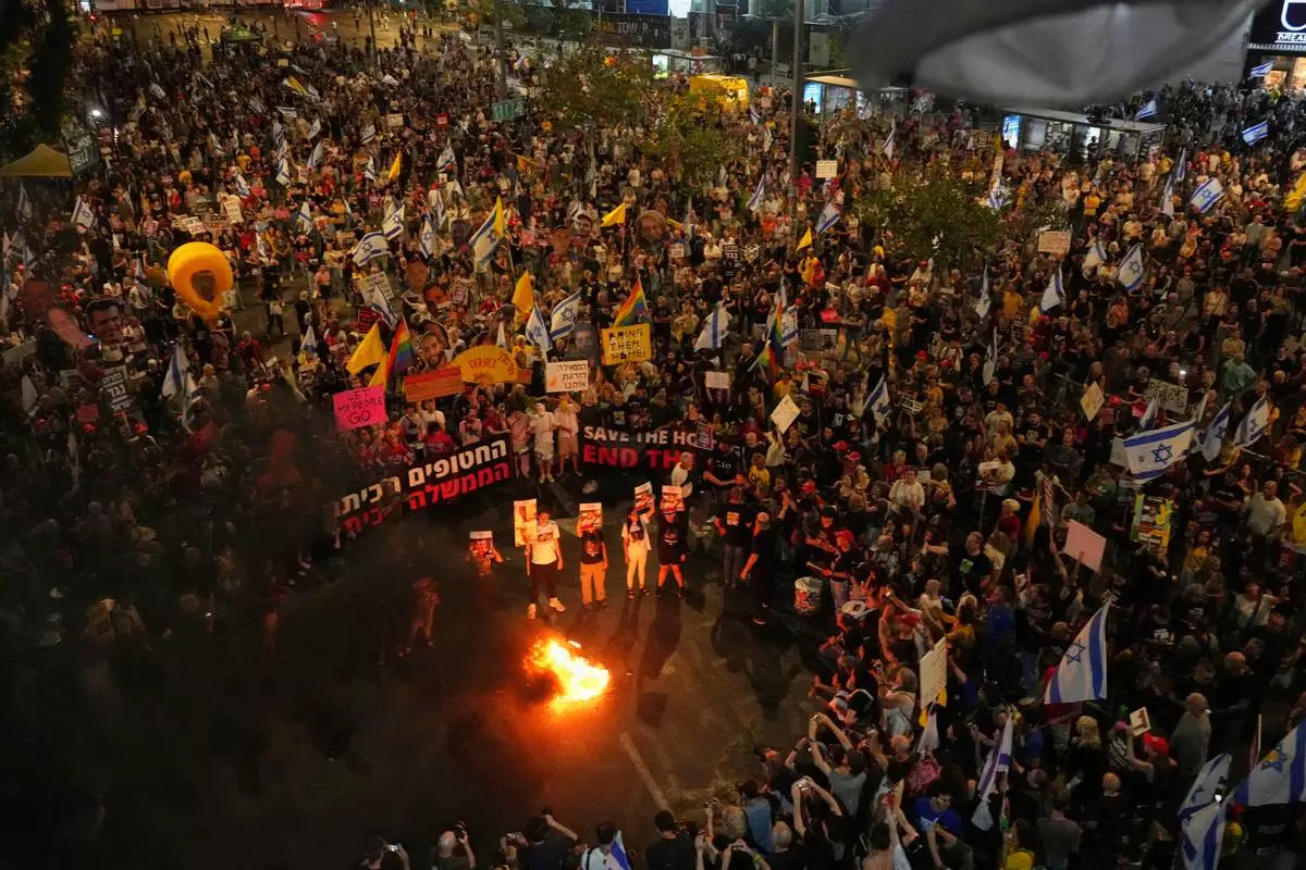People take part in a protest demanding the end of the war and immediate release of hostages held by Hamas in the Gaza Strip, and against Prime Minister Benjamin Netanyahu's government, in Tel Aviv, Saturday, May 31, 2025. (AP Photo/Ariel Schalit)