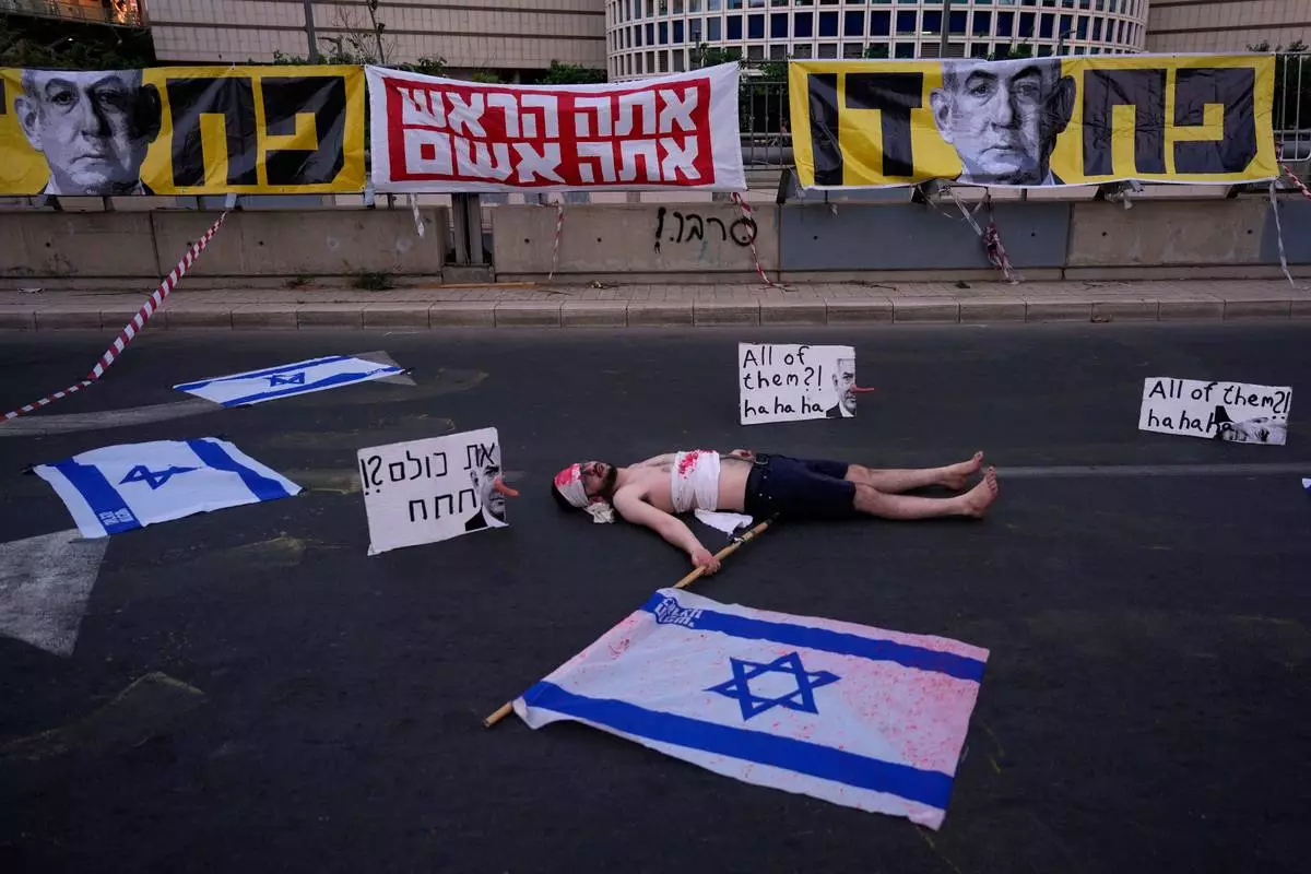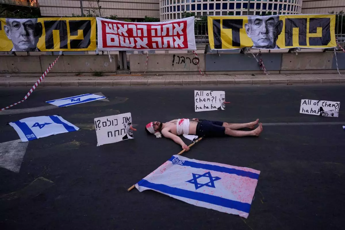 A demonstrator takes part in a performance during a protest demanding the end of the war and immediate release of hostages held by Hamas in the Gaza Strip, and against Prime Minister Benjamin Netanyahu's government in Tel Aviv, Saturday, May 31, 2025. (AP Photo/Ariel Schalit)