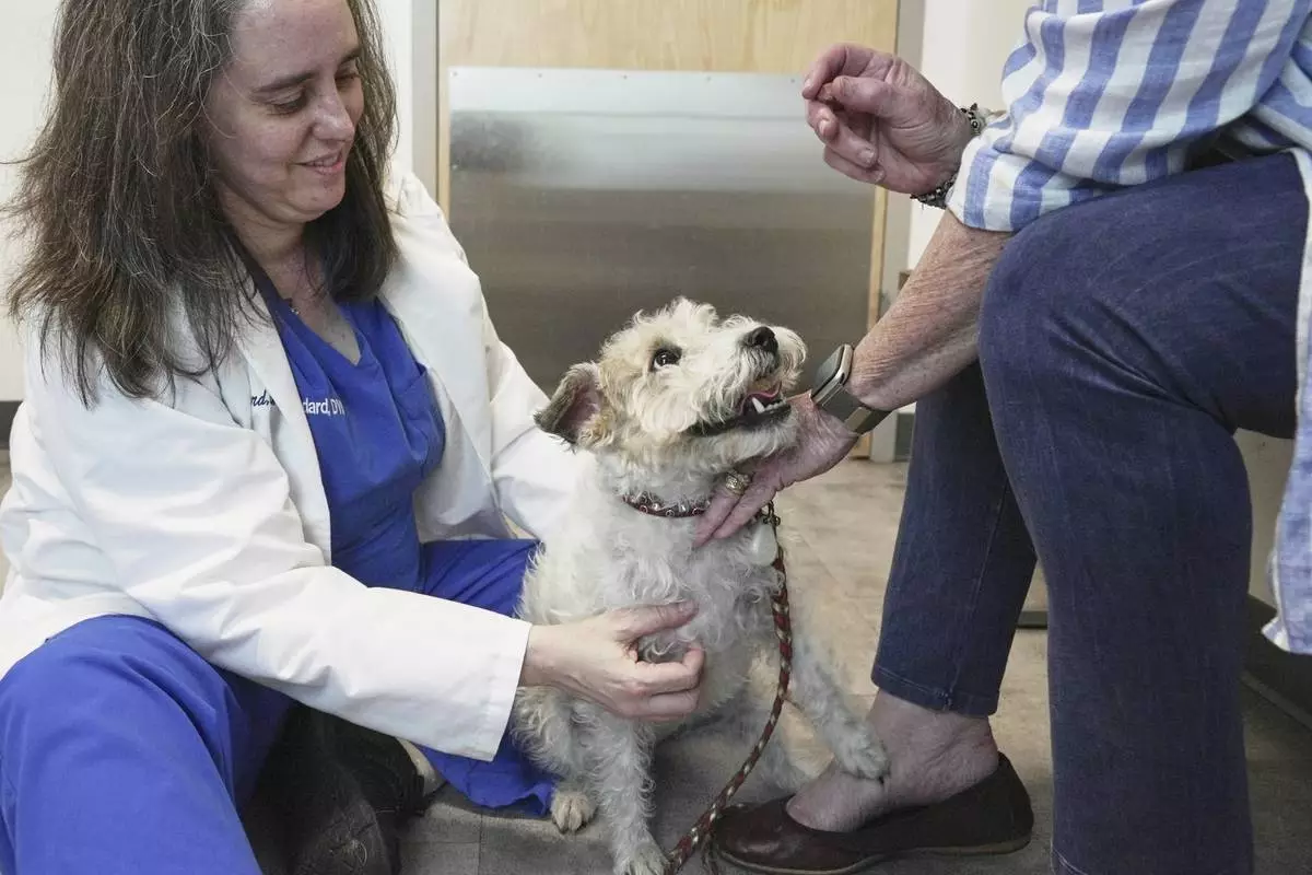 Dr. Karen Woodard check's Gail Friedman's dog, Ms. Roxie, for signs of allergies in Elmhurst, Ill. on May 13, 2025. (AP Photo/Laura Bargfeld)