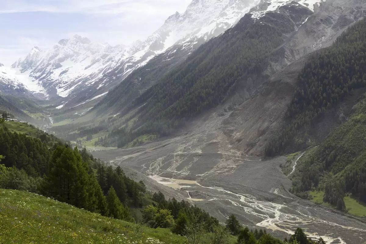 A huge mass of rock, ice and mud from the Birch glacier thundered into the Lötschental valley in southern Switzerland on Wednesday, destroying much of the village. Buildings that weren't buried were submerged in a lake created by the small Lonza River, whose course was dammed by the mass of material.
