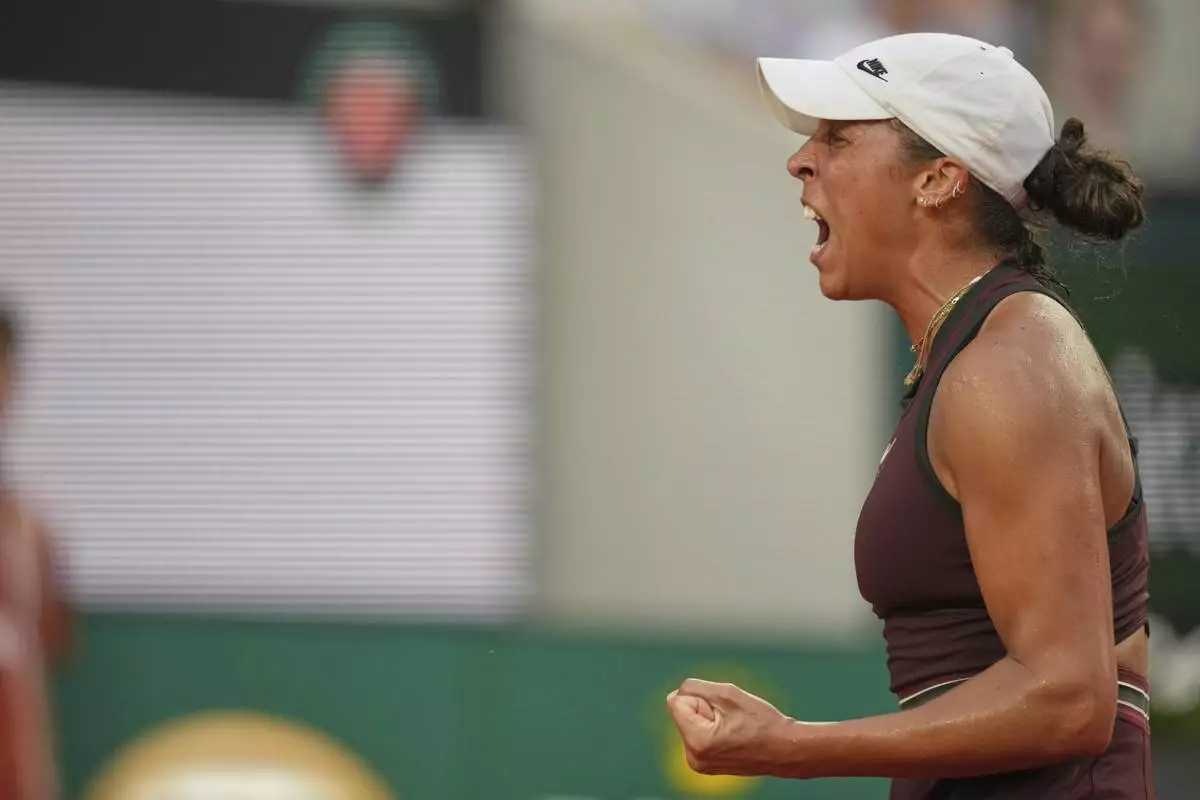 Madison Keys of the U.S. reacts winning a point United States' Sofia Kenin during their third round match of the French Tennis Open, at the Roland-Garros stadium, in Paris, Saturday, May 31, 2025. (AP Photo/Thibault Camus)