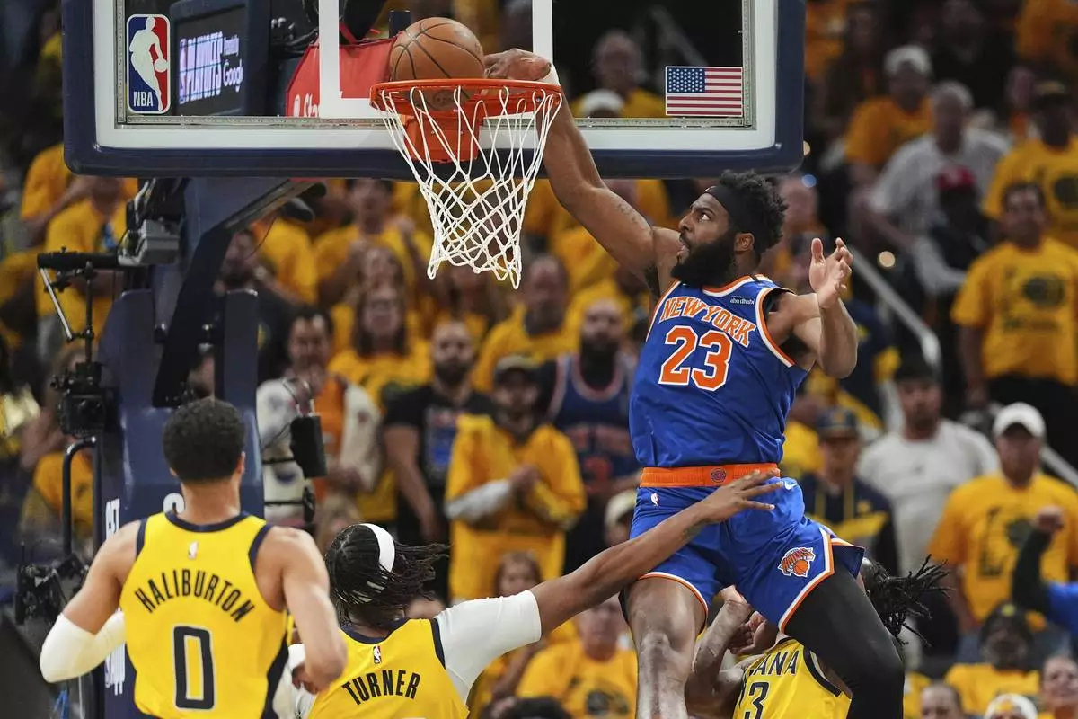 New York Knicks center Mitchell Robinson (23) dunks during the first half of Game 6 of the Eastern Conference finals of the NBA basketball playoffs against the Indiana Pacers in Indianapolis, Saturday, May 31, 2025. (AP Photo/Michael Conroy)