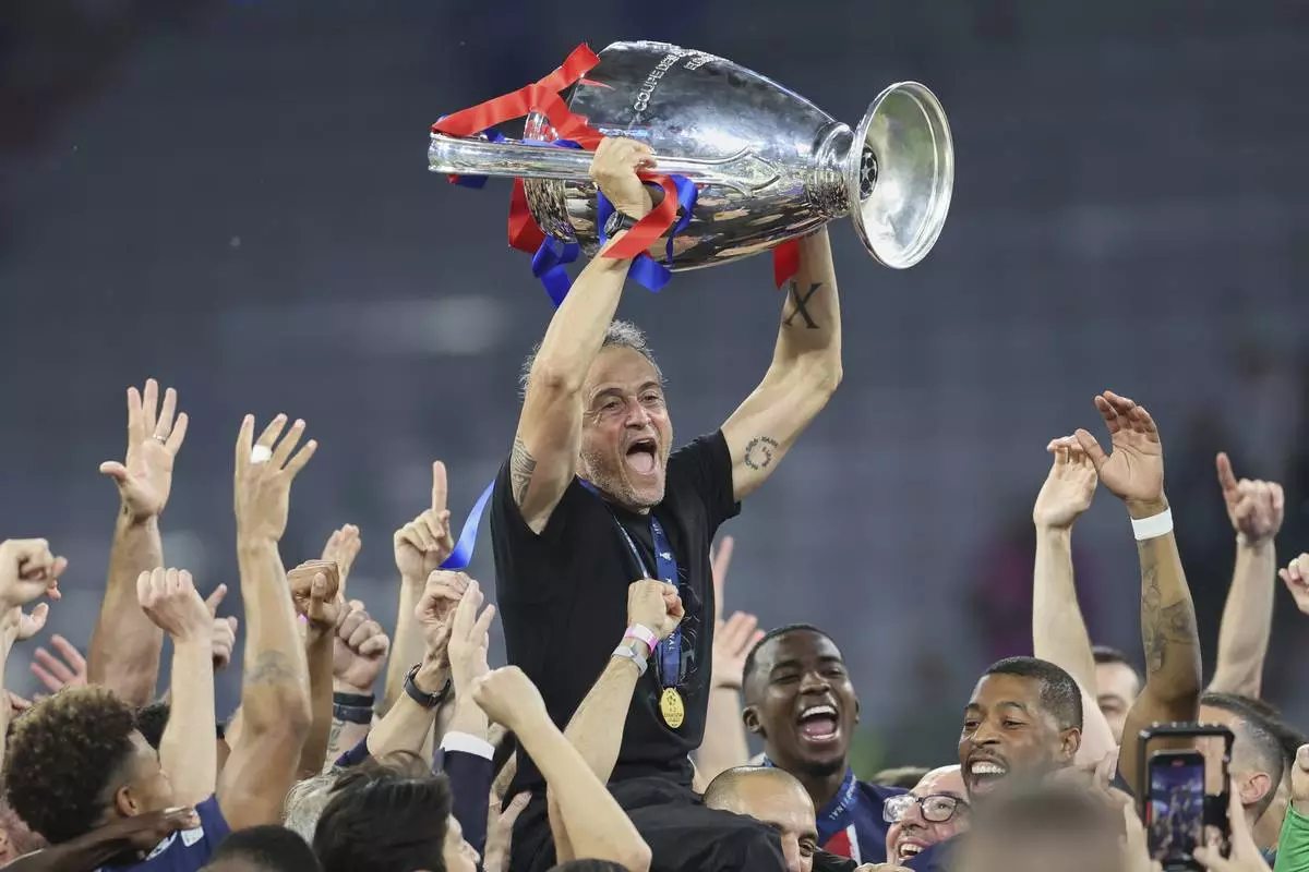 PSG's head coach Luis Enrique lifts the trophy after the Champions League final soccer match between Paris Saint-Germain and Inter Milan at the Allianz Arena in Munich, Germany, Saturday, May 31, 2025. (AP Photo/Alexandra Beier)