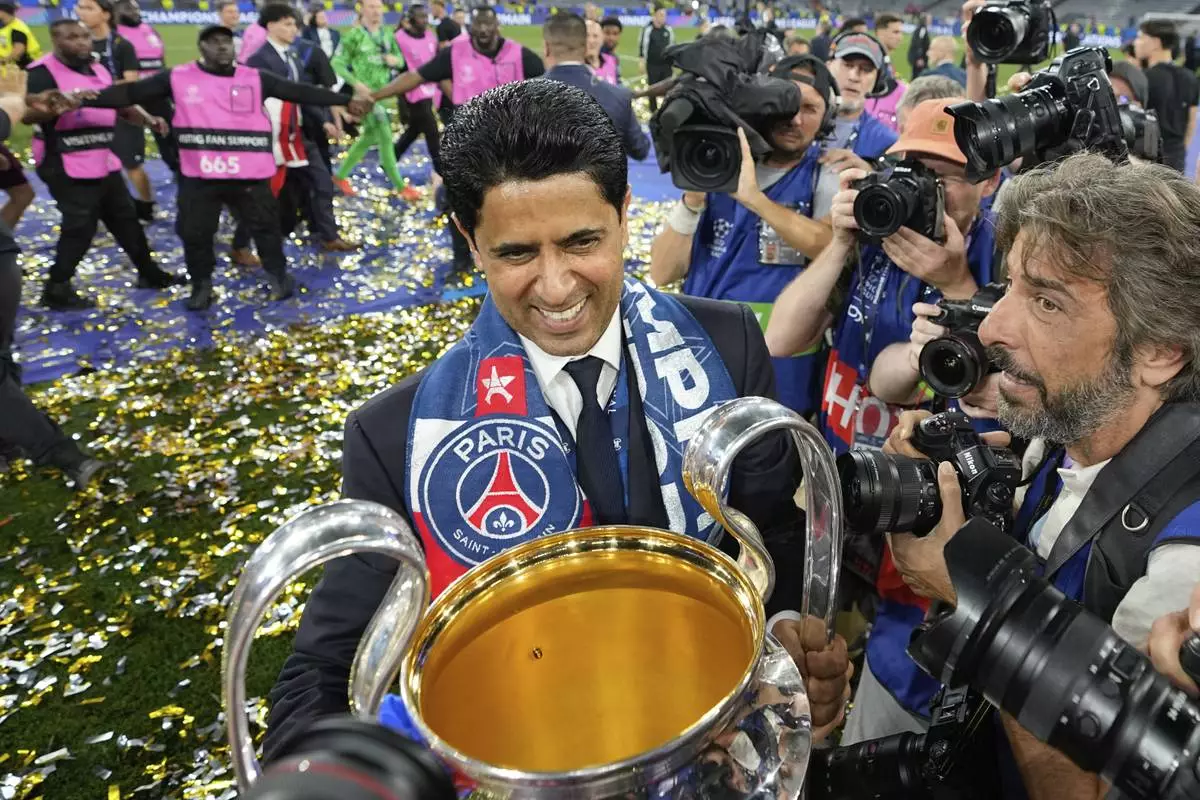 PSG president Nasser Al-Khelaifi holds the Champions League trophy after their win in the final soccer match against Inter Milan at the Allianz Arena in Munich, Germany, Saturday, May 31, 2025. (AP Photo/Martin Meissner)