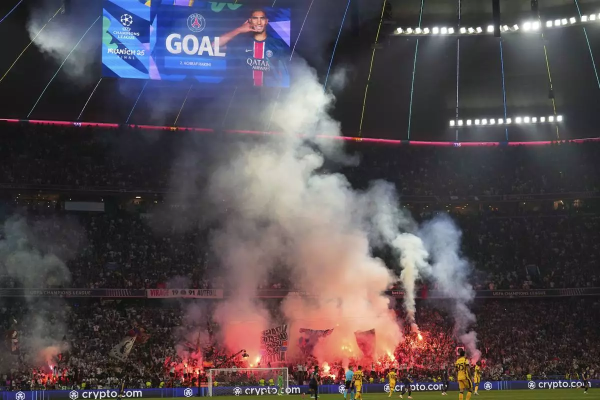 PSG's fans light flares after Achraf Hakimi scored his side's first goal during the Champions League final soccer match between Paris Saint-Germain and Inter Milan at the Allianz Arena in Munich, Germany, Saturday, May 31, 2025. (AP Photo/Matthias Schrader)