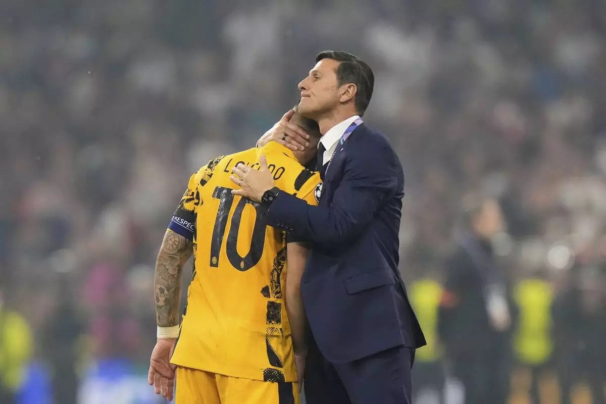 Former Inter Milan player Javier Zanetti, right, hugs Inter Milan's team captain Lautaro Martinez at the end of the Champions League final soccer match between Paris Saint-Germain and Inter Milan at the Allianz Arena in Munich, Germany, Saturday, May 31, 2025. (AP Photo/Luca Bruno)