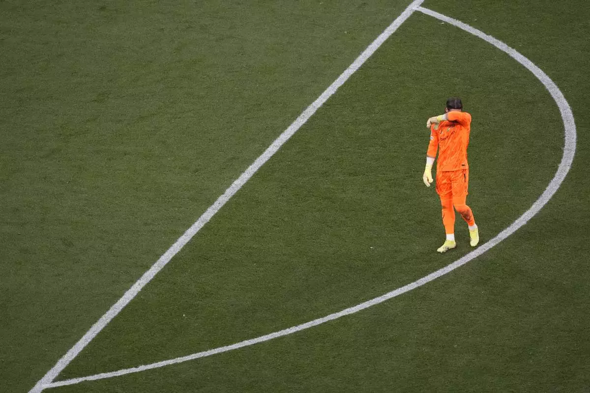 Inter Milan's goalkeeper Yann Sommer reacts after a goal of PSG's Desire Doue during the Champions League final soccer match between Paris Saint-Germain and Inter Milan at the Allianz Arena in Munich, Germany, Saturday, May 31, 2025. (AP Photo/Michael Probst)