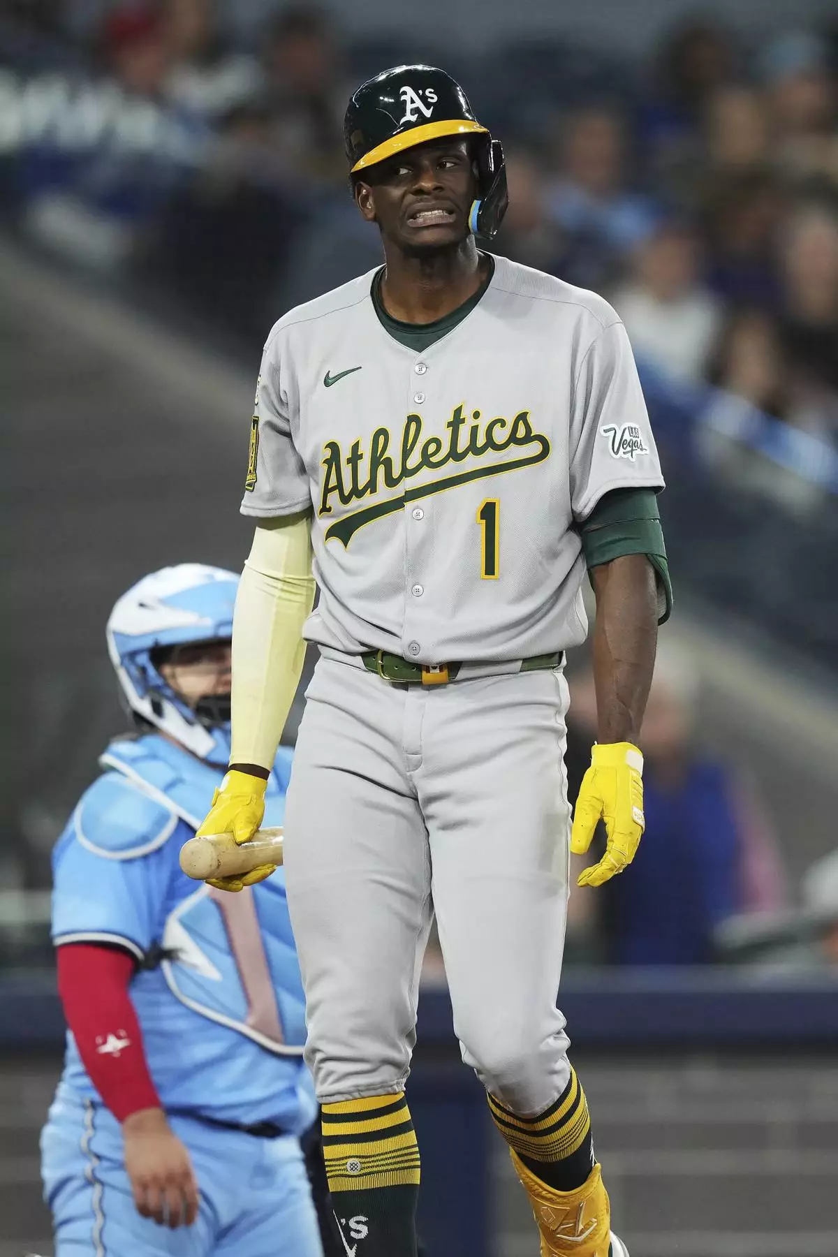 Athletics' Denzel Clarke (1) reacts after striking out against the Toronto Blue Jays during the seventh inning of a baseball game in Toronto, Thursday, May 29, 2025. (Nathan Denette/The Canadian Press via AP)
