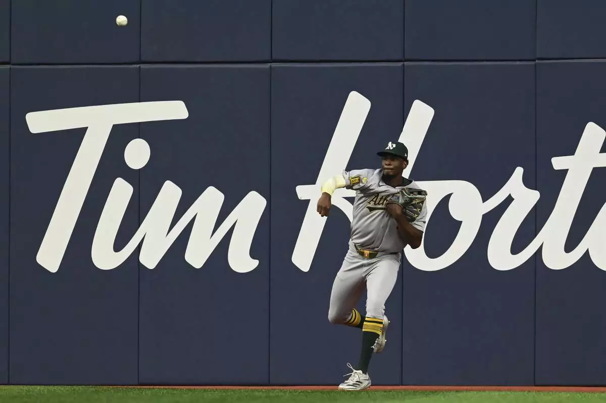 Athletics center fielder Denzel Clarke (1) fields a ball off the bat of Toronto Blue Jays' Ernie Clement in second inning MLB baseball action in Toronto on Friday, May 30, 2025. (Jon Blacker/The Canadian Press via AP)