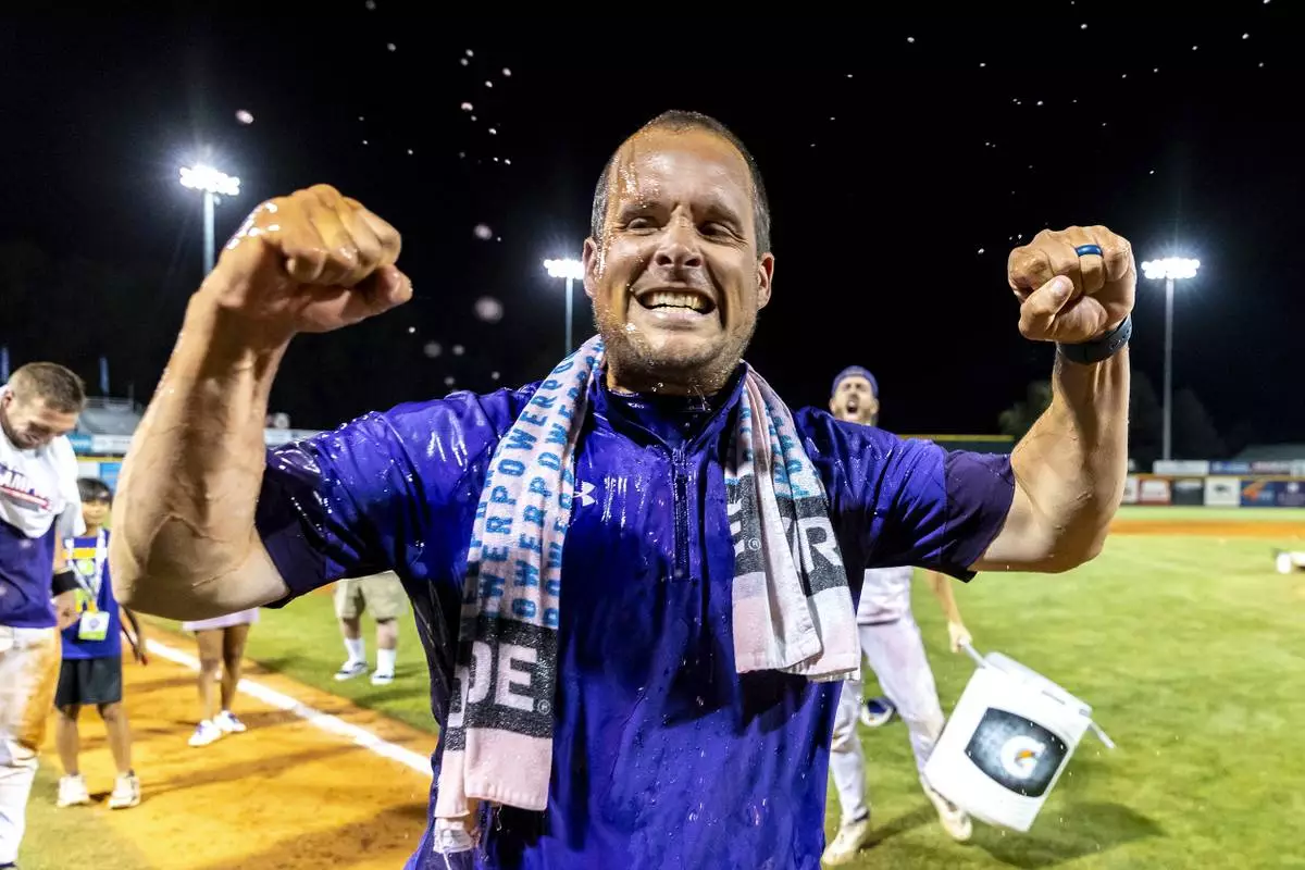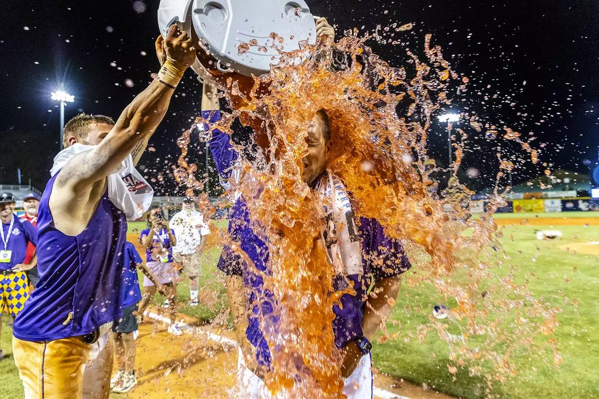 LSU Shreveport head coach Brad Neffendorf is doused by his players after defeating Southeastern of Florida to win the championship game of the NAIA World Series college baseball game, Friday, May 30 2025, at Harris Field in Lewiston, Idaho. (August Frank/Lewiston Tribune via AP)