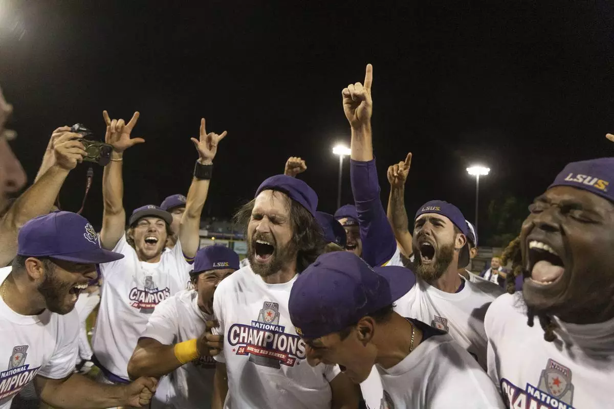 LSU Shreveport celebrates after defeating Southeastern of Florida to win the championship game of the NAIA World Series college baseball game, Friday, May 30 2025, at Harris Field in Lewiston, Idaho. (August Frank/Lewiston Tribune via AP)