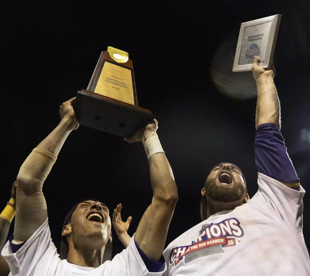 LSU Shreveport's Jose Sallorin, left, celebrates with the championship trophy after defeating Southeastern of Florida to win the championship game of the NAIA World Series colllege baseall game, Friday, May 30 2025, at Harris Field in Lewiston, Idaho. (Arthur H. Trickett-Wile/Lewiston Tribune via AP)