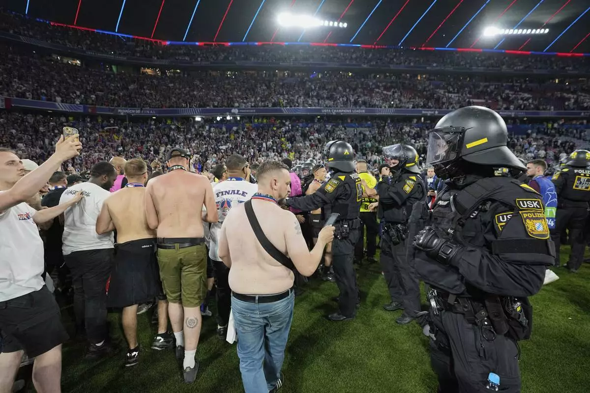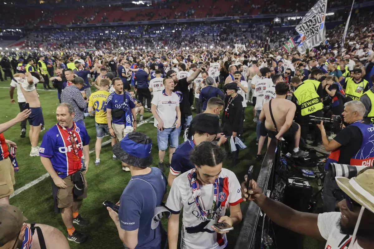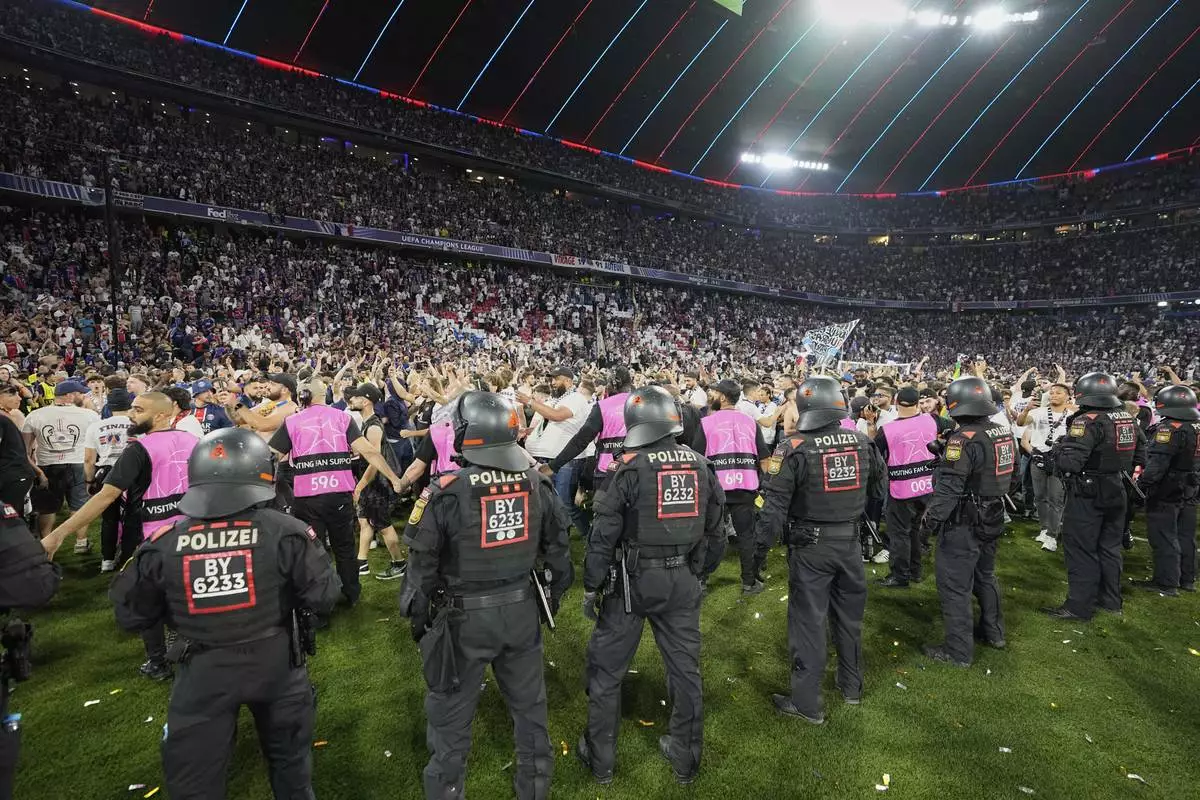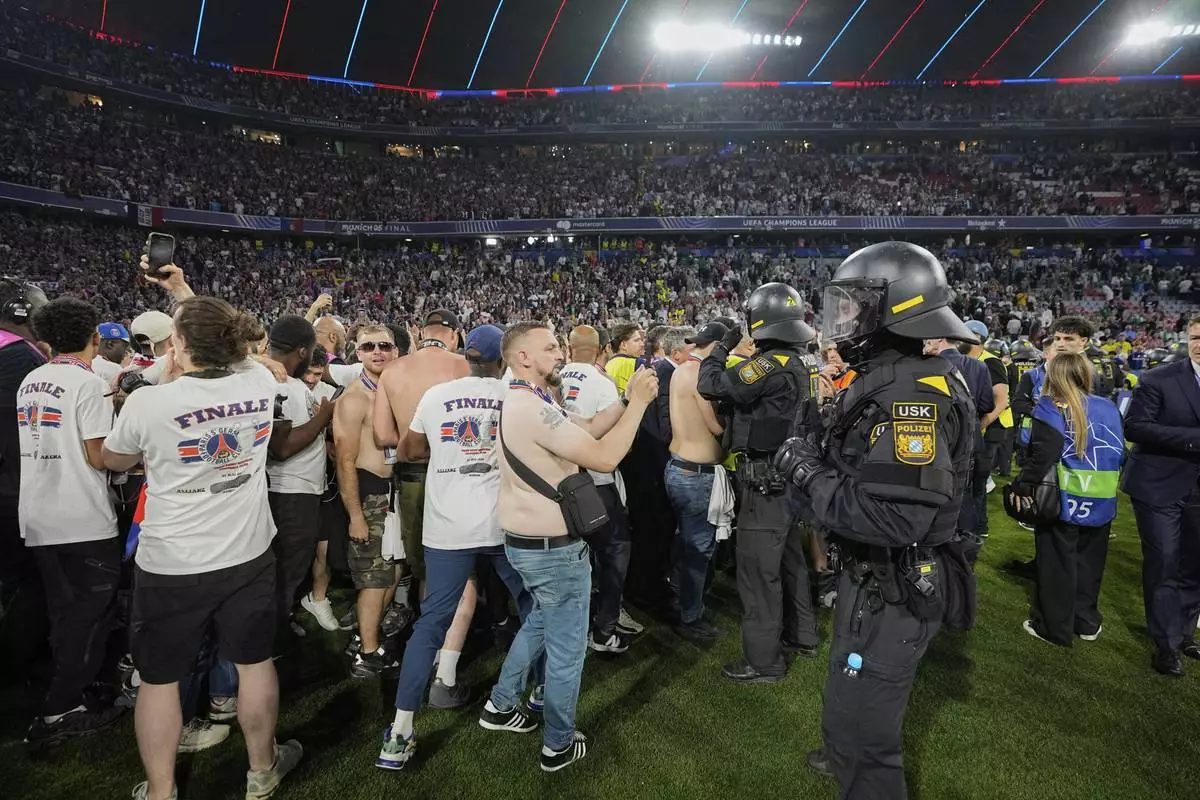 MUNICH (AP) — Paris Saint-Germain fans had to be held back by a line of police when trying to rush the field after the Champions League final on Saturday.
