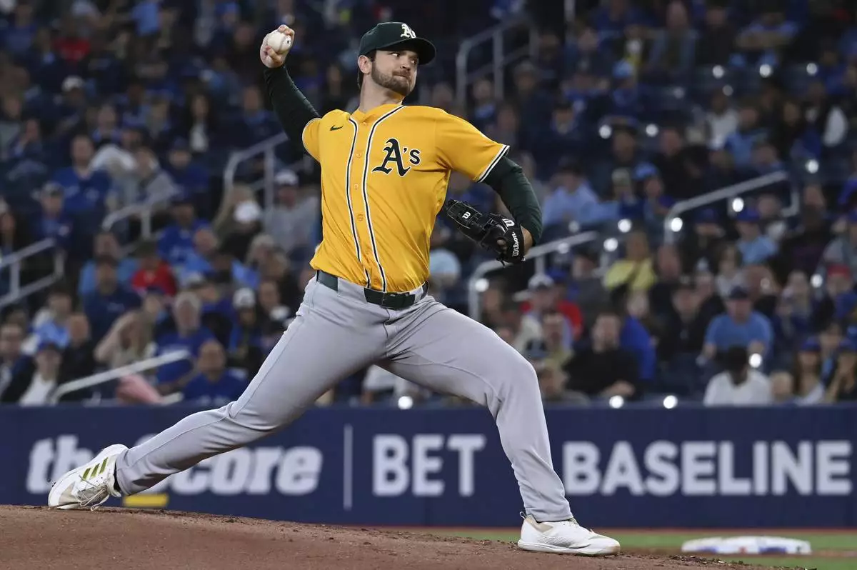 Athletics starting pitcher Gunnar Hoglund (53) throws to a Toronto Blue Jays batter in the first inning of a baseball game in Toronto, Saturday, May 31, 2025. (Jon Blacker/The Canadian Press via AP)