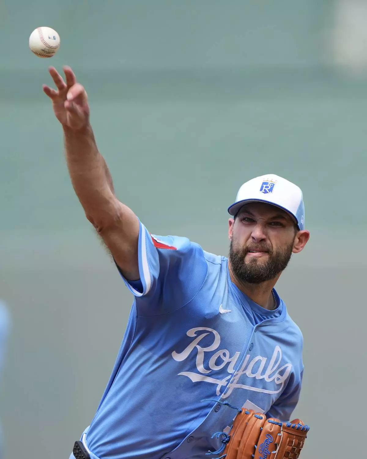 Kansas City Royals starting pitcher Michael Wacha throws during the first inning of a baseball game against the Detroit Tigers, Saturday, May 31, 2025, in Kansas City, Mo. (AP Photo/Charlie Riedel)
