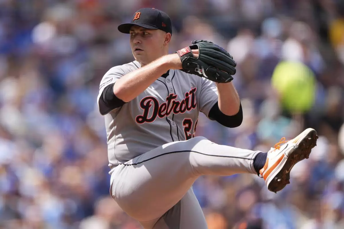 Detroit Tigers starting pitcher Tarik Skubal throws during the first inning of a baseball game against the Kansas City Royals, Saturday, May 31, 2025, in Kansas City, Mo. (AP Photo/Charlie Riedel)