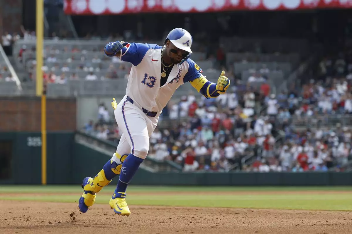 Atlanta Braves' Ronald Acuña Jr. celebrates as he rounds the bases after hitting a home run during the fourth inning of a baseball game against the Boston Red Sox, Saturday, May 31, 2025, in Atlanta. (AP Photo/Butch Dill)