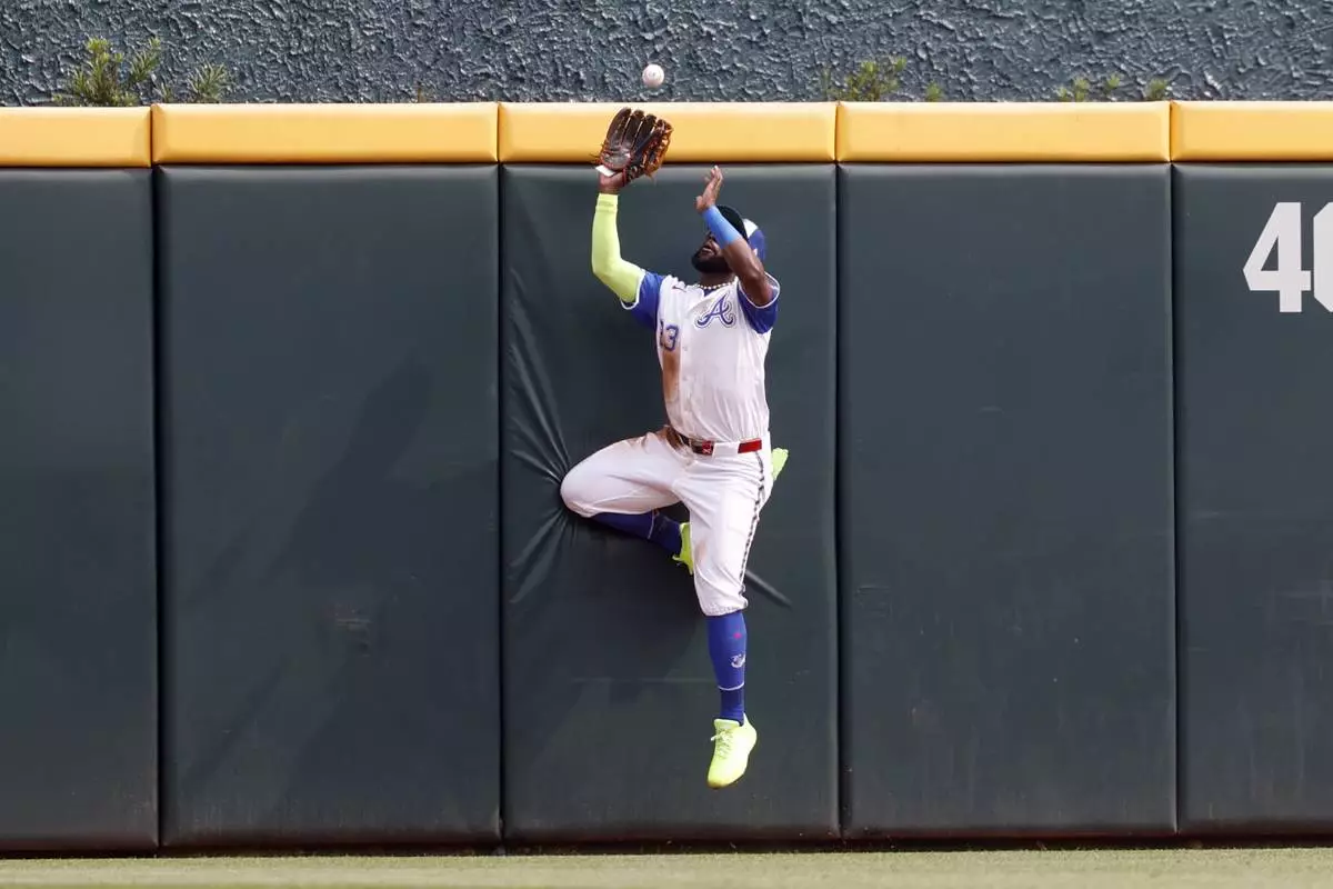 Atlanta Braves outfielder Michael Harris II catches a deep fly ball for an out against Boston Red Sox's Trevor Story during the third inning of a baseball game, Saturday, May 31, 2025, in Atlanta. (AP Photo/Butch Dill)