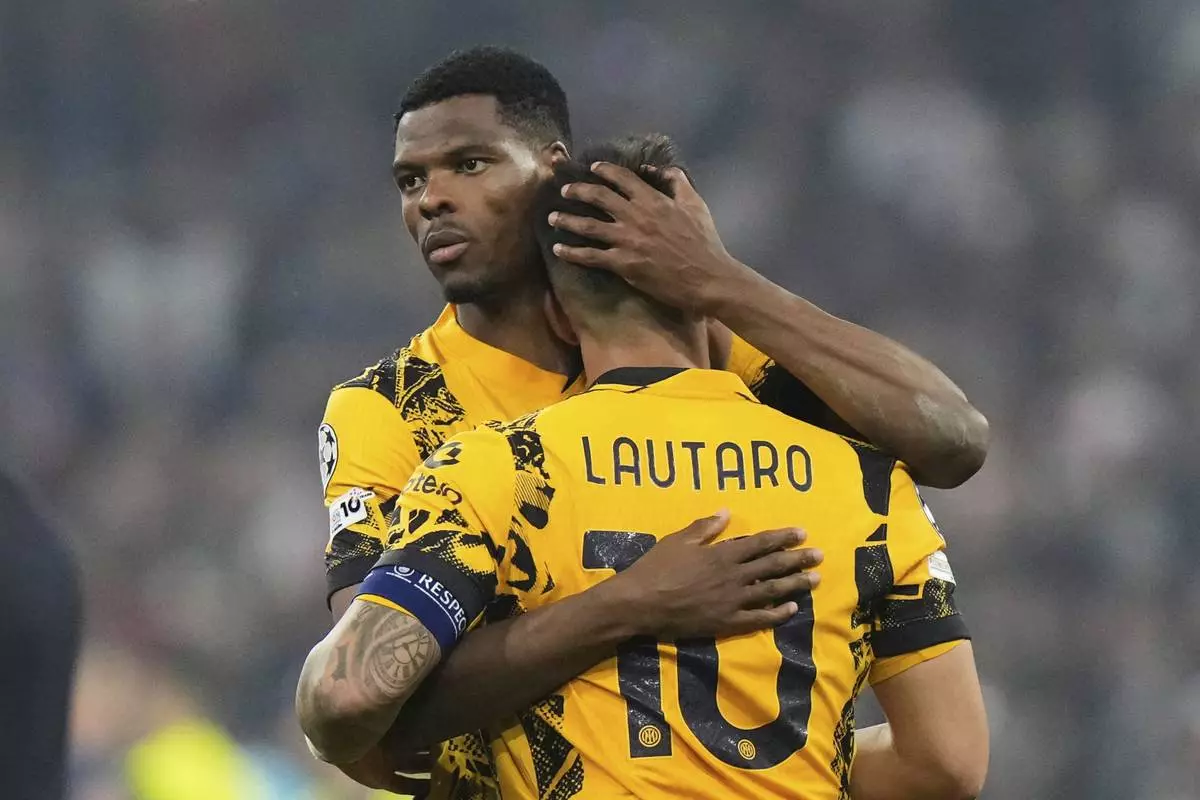 Inter Milan's Denzel Dumfries embraces teammate Lautaro Martinez at the end of the Champions League final soccer match between Paris Saint-Germain and Inter Milan at the Allianz Arena in Munich, Germany, Saturday, May 31, 2025. (AP Photo/Luca Bruno)