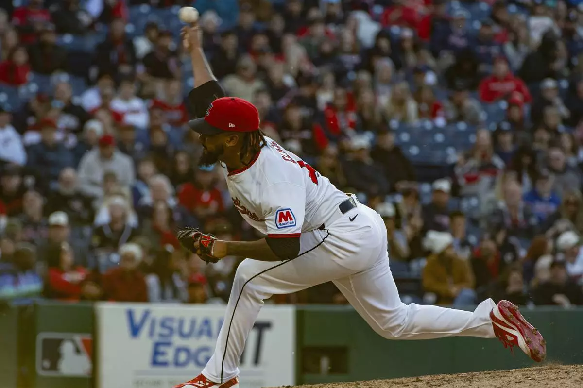 Cleveland Guardians relief pitcher Emmanuel Clase delivers against the Los Angeles Angels during the ninth inning of a baseball game, Saturday, May 31, 2025, in Cleveland. (AP Photo/Phil Long)