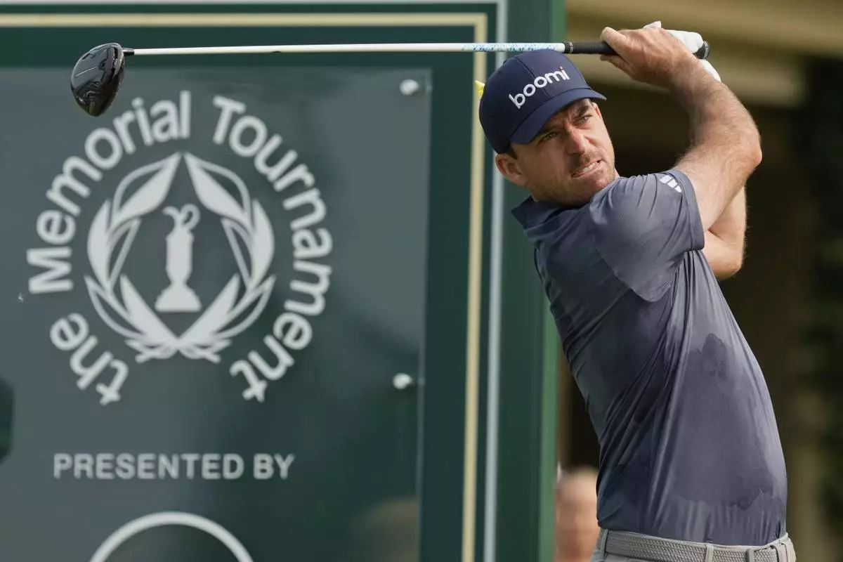 Nick Taylor hits from the 10th tee during the third round of the Memorial golf tournament Saturday, May 31, 2025, in Dublin, Ohio. (AP Photo/Sue Ogrocki)