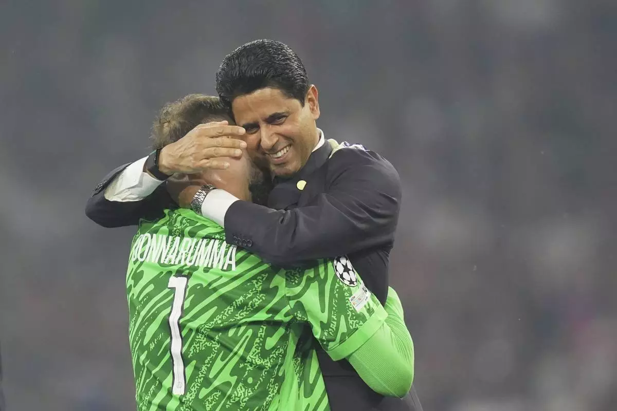 PSG's goalkeeper Gianluigi Donnarumma embraces PSG's President Nasser Al-Khelaifi after the Champions League Final soccer match between Paris Saint Germain and Inter at the Allianz Arena in Munich, Germany, Saturday May 31, 2025 . (Spada/LaPresse via AP)